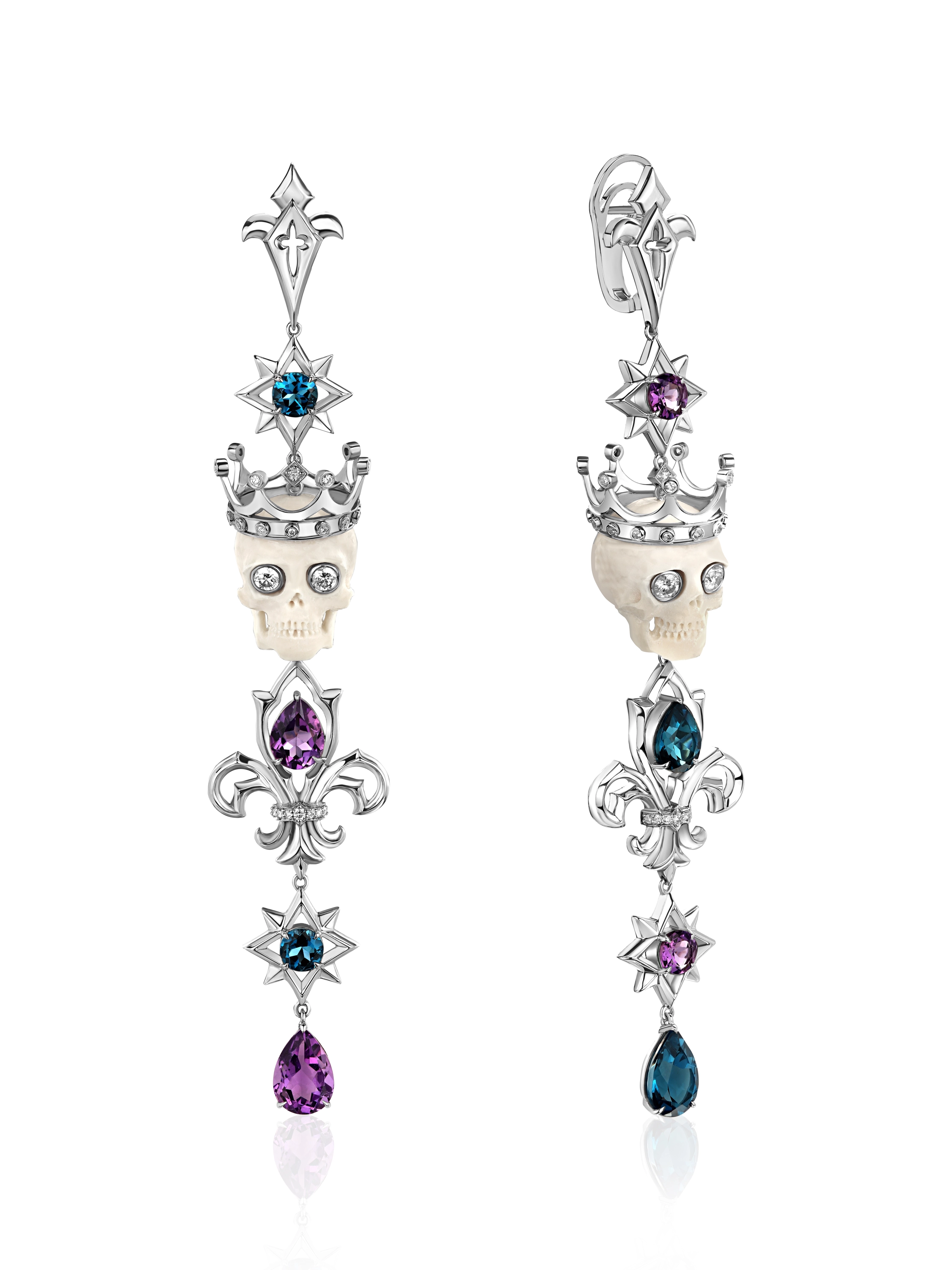 White gold earrings set with 62 round-cut diamonds with a total weight of 0.74 ct, 2 round-cut amethysts with a total weight of 0.80 ct, 2 pear-cut amethysts with a total weight of 2.70 ct, 2 round-cut London Blue topazes with a total weight of 1.05 ct, 2 pear-cut London Blue topazes with a total weight of 3.55 ct, and 2 mammoth tusk skulls with a total weight of 5.94 g. The length of the piece is 11 cm.
