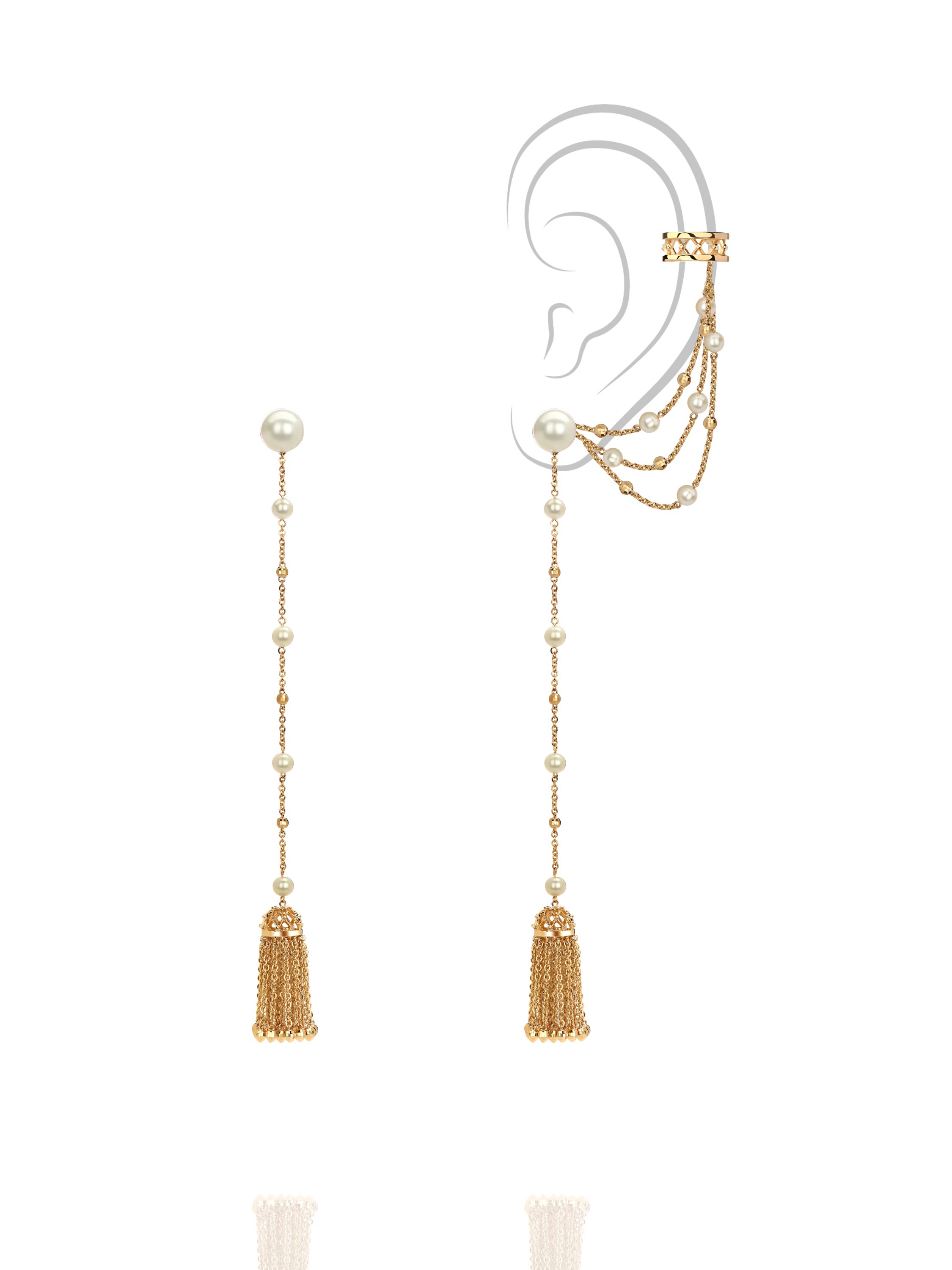 Tassel earrings with detachable cuff in yellow gold and pearls