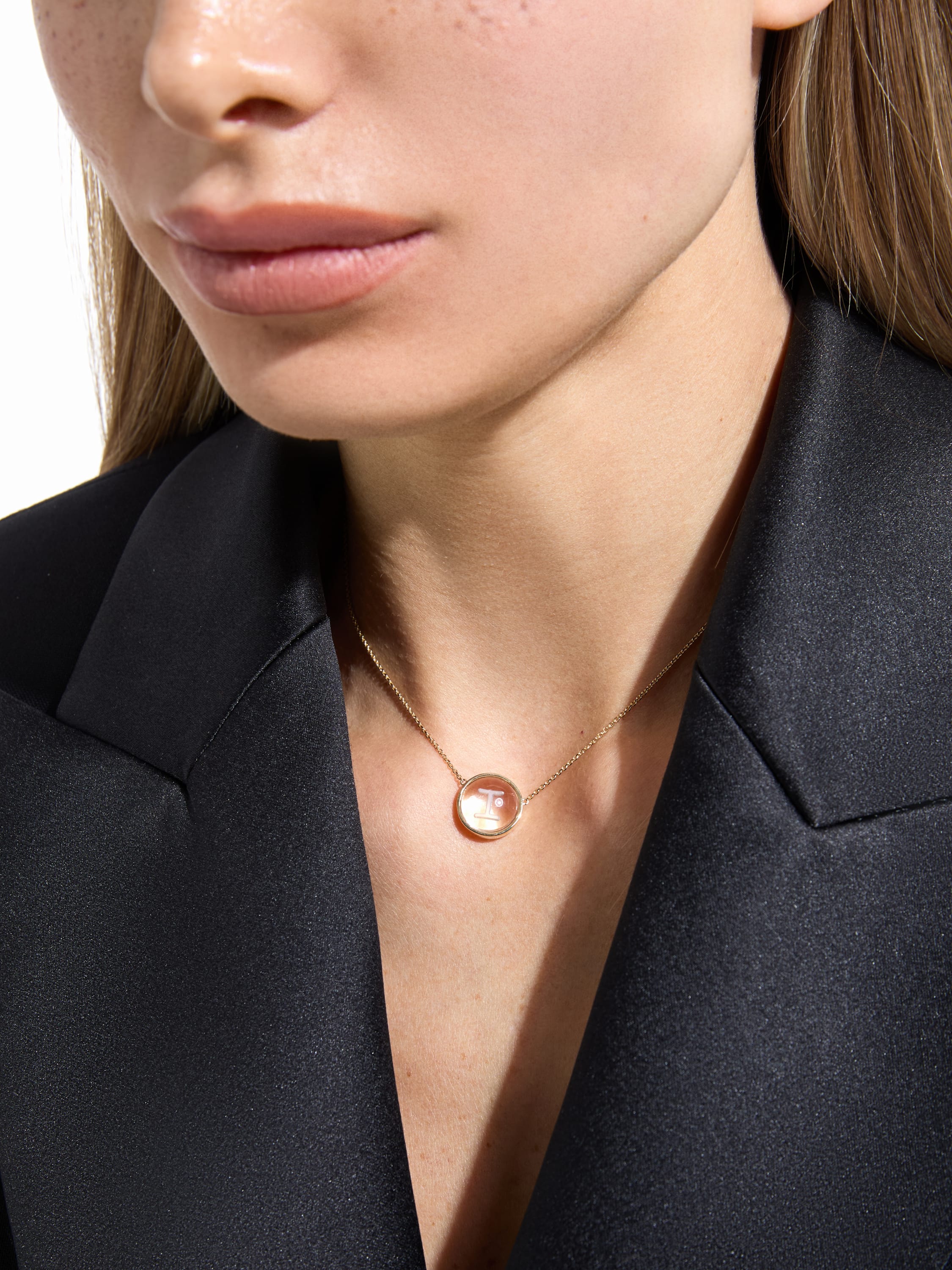 Yellow gold necklace with letter I pendant and rock crystal