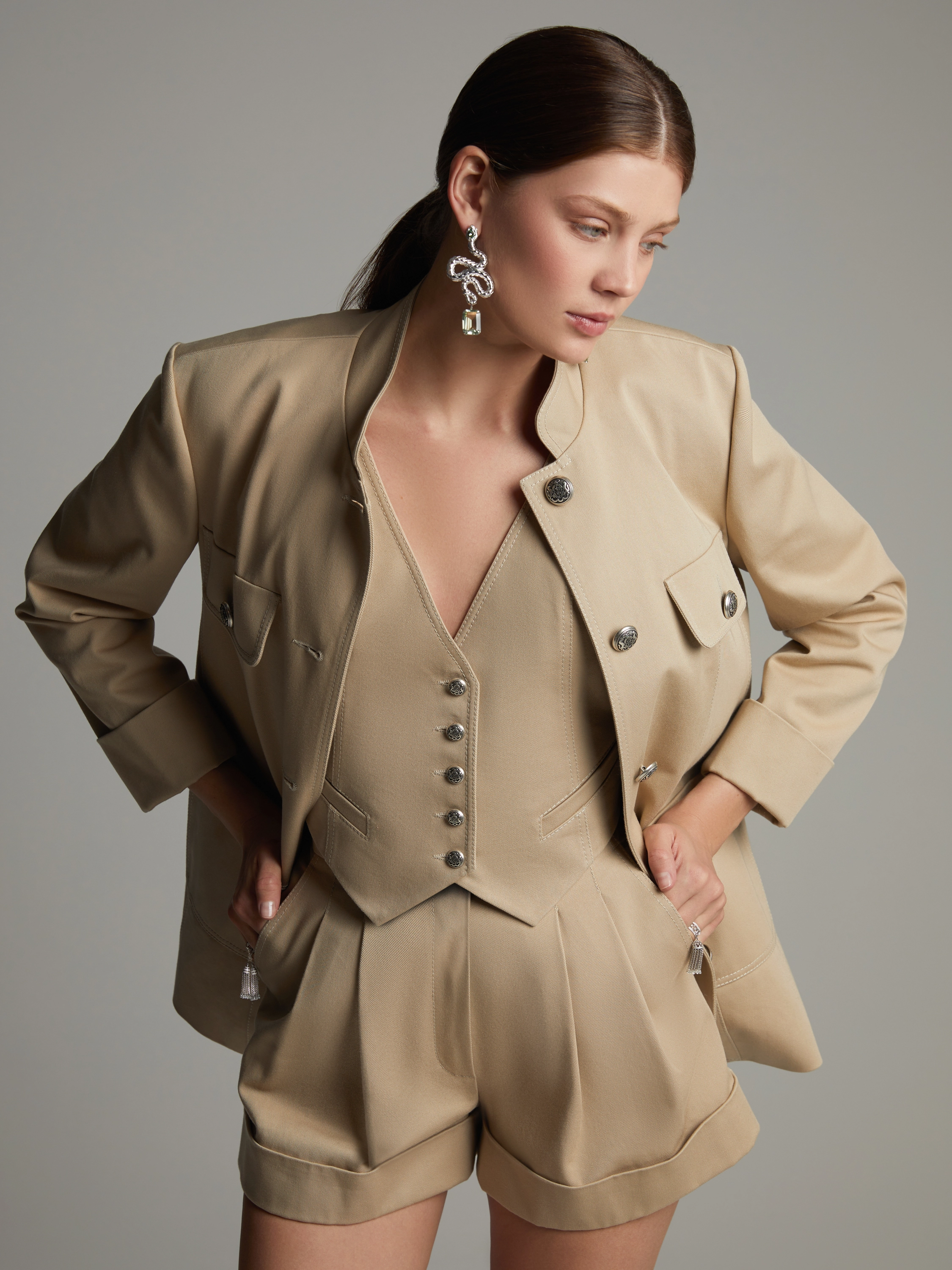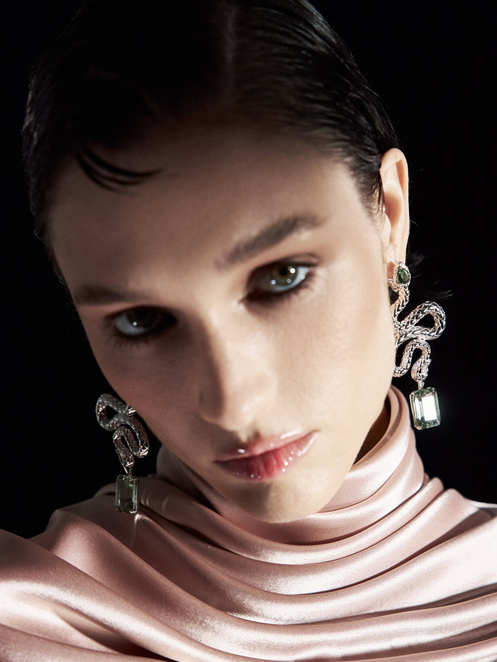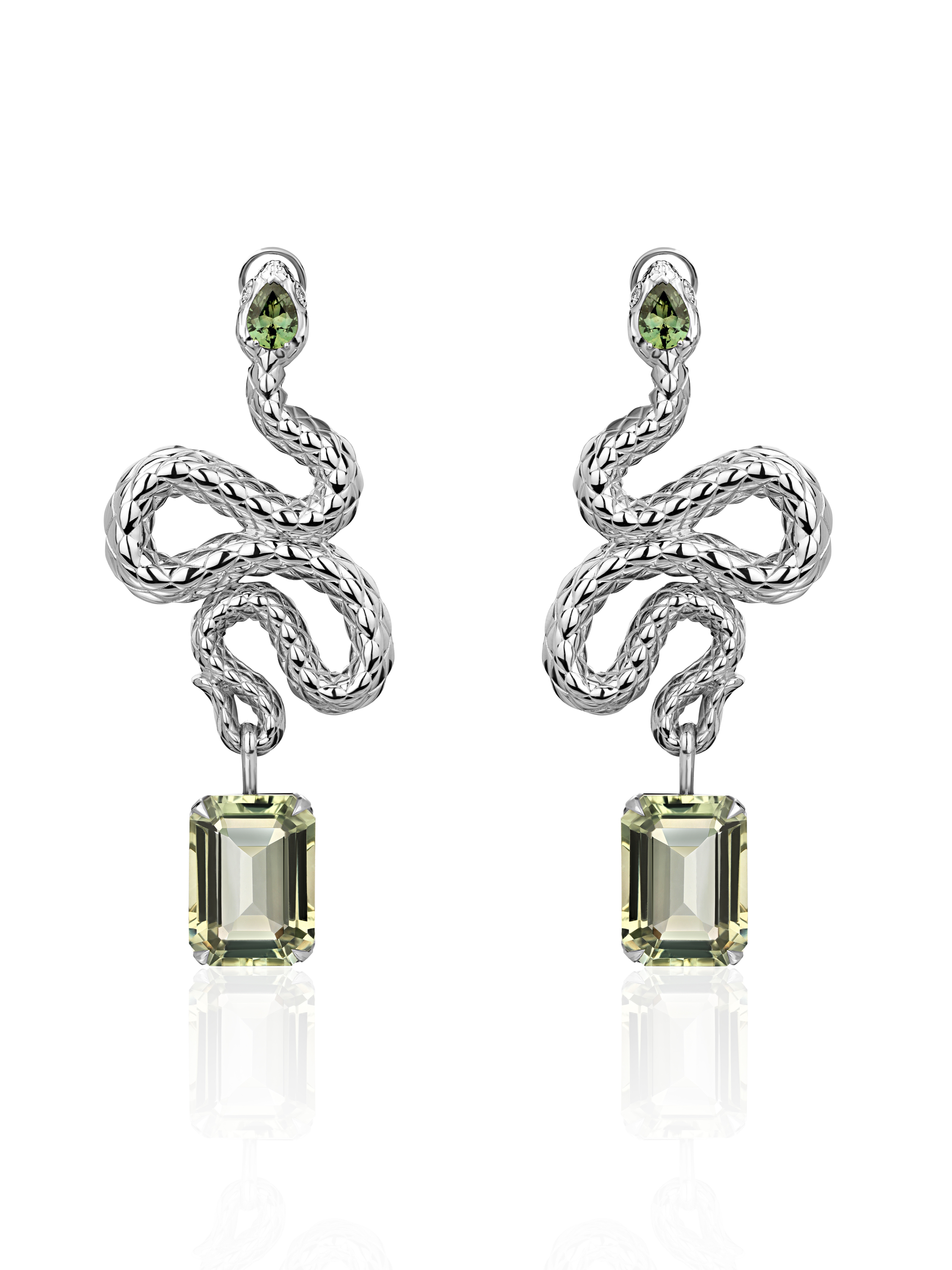 Snake-shaped earrings in white gold with 2 prasiolites with a total weight of 28.46 ct, 2 green sapphires in pear cut weighing 2.42 ct, and 4 round-cut diamonds with a total weight of 0.08 ct. Item length: 8 cm.