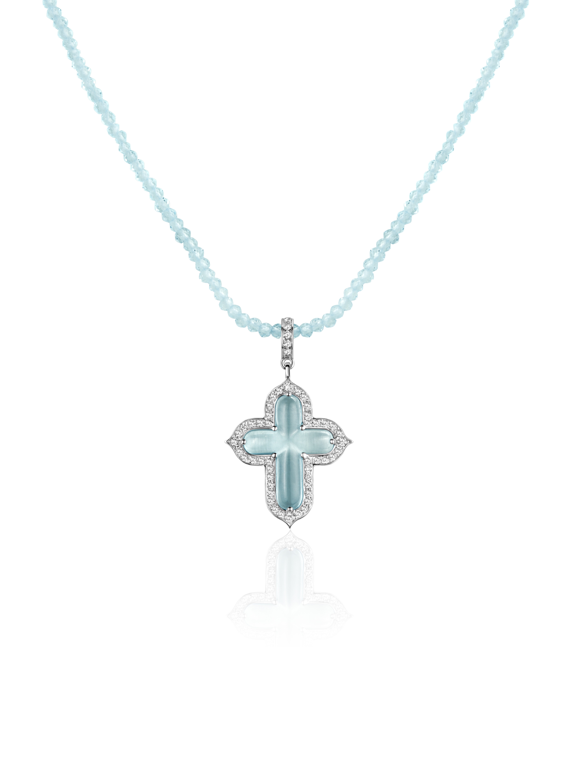 White gold necklace with a cross-shaped pendant with Sky topaz 2.74 ct, 215 Sky topaz beads 3.22 ct d 2.0, and 59 round LG diamonds 0.19 ct.