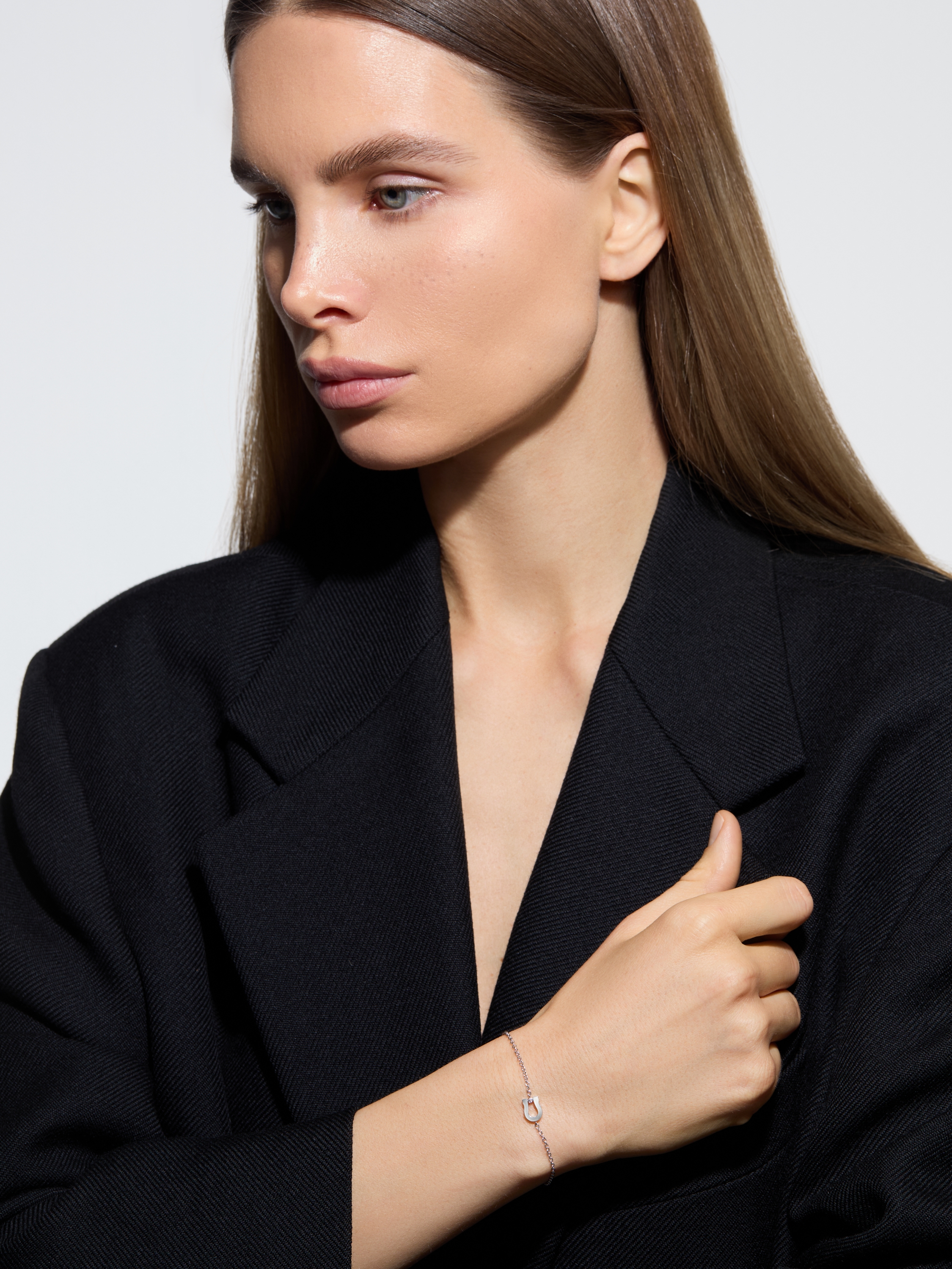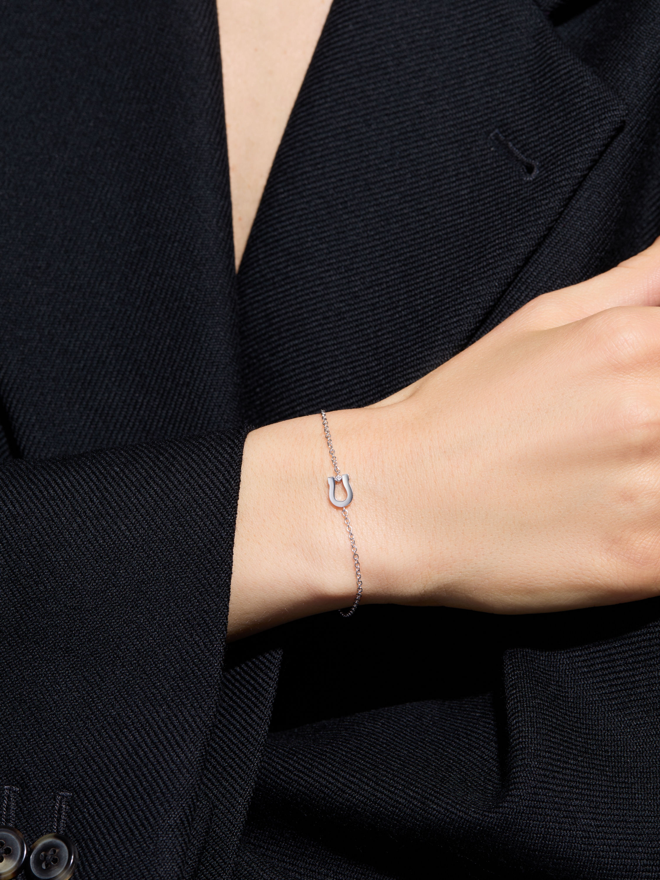 18K white gold horseshoe bracelet with a round-cut diamond weighing 0.02 ct.