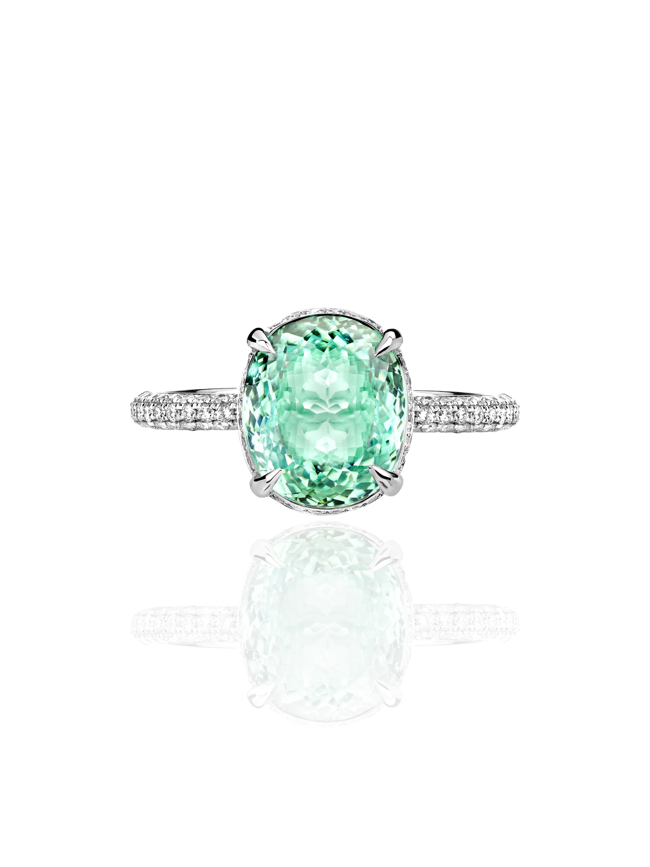 A white gold ring with 1 mint tourmaline weighing 11.43 ct and 208 round-cut diamonds weighing 0.94 ct.