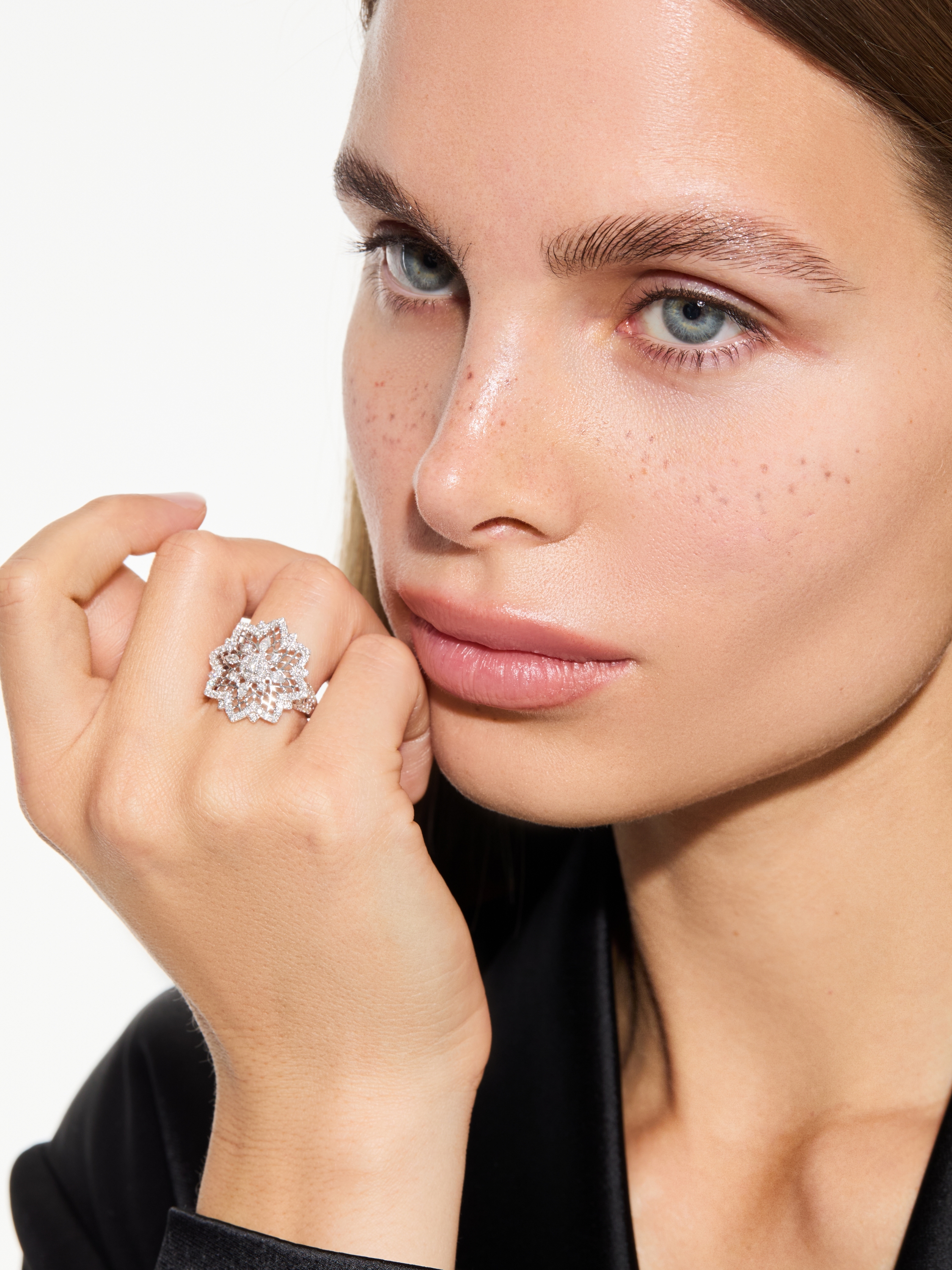 White gold ring with 4 marquise-cut diamonds 0.19 ct and 89 round diamonds.
