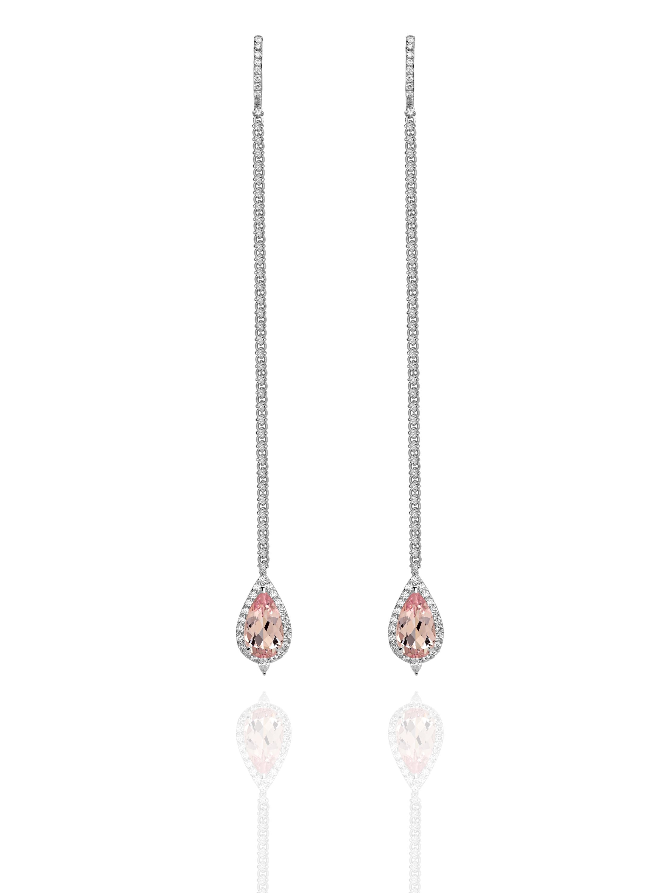 Long earrings made of white gold with pear-cut morganites and diamonds