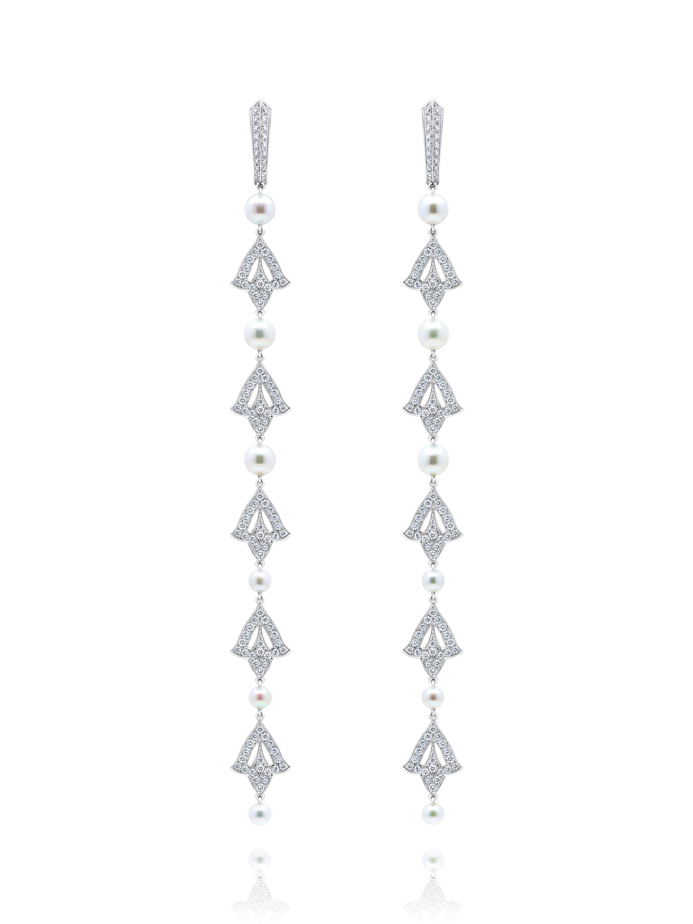 Earrings in 18K white gold with 12 white pearls weighing 1.46 g and 250 round diamonds weighing 1.82 ct. Item length: 13 cm.