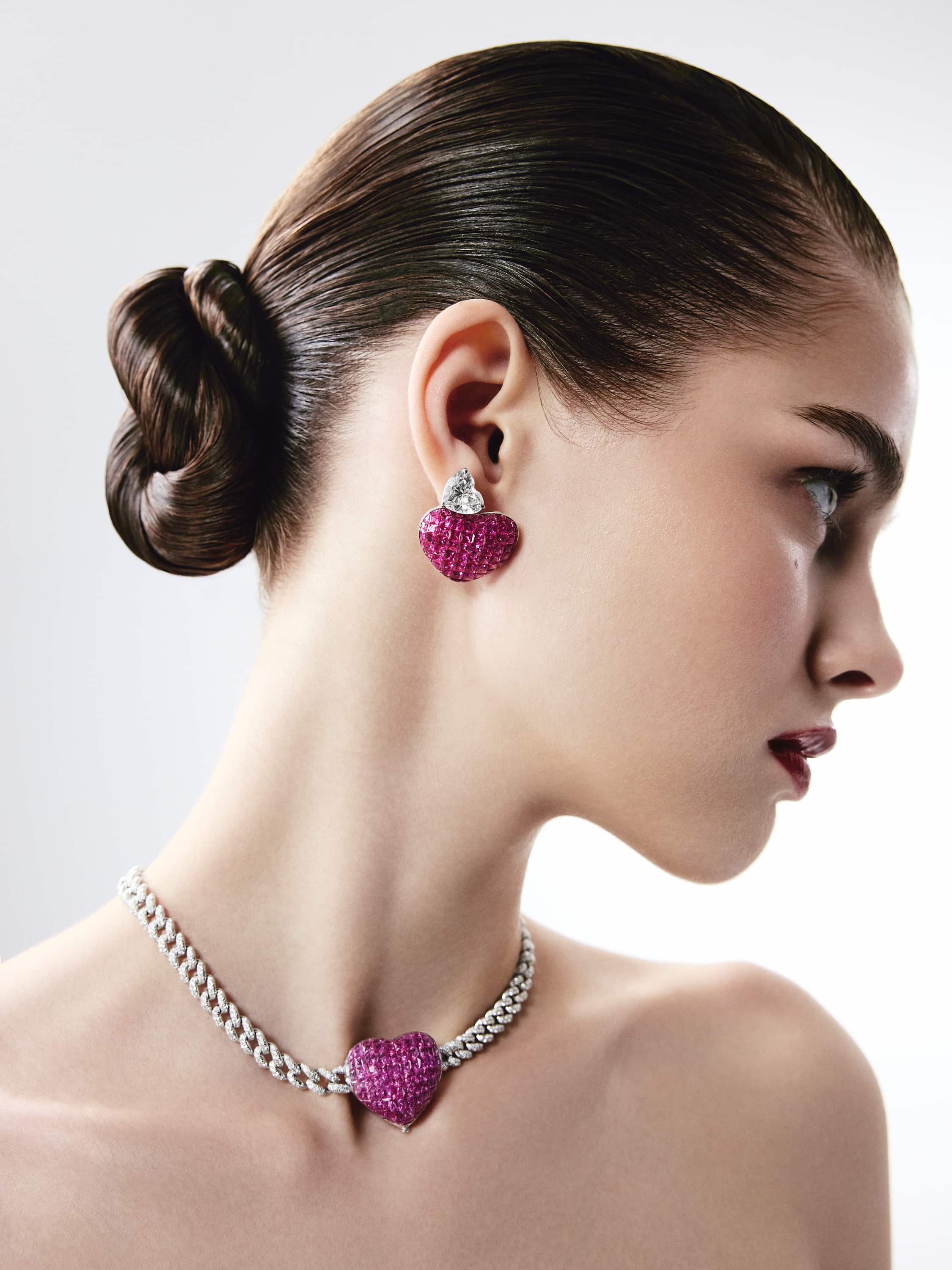 White gold stud earrings with 146 round-cut rubies with a total weight of 24.83 ct.