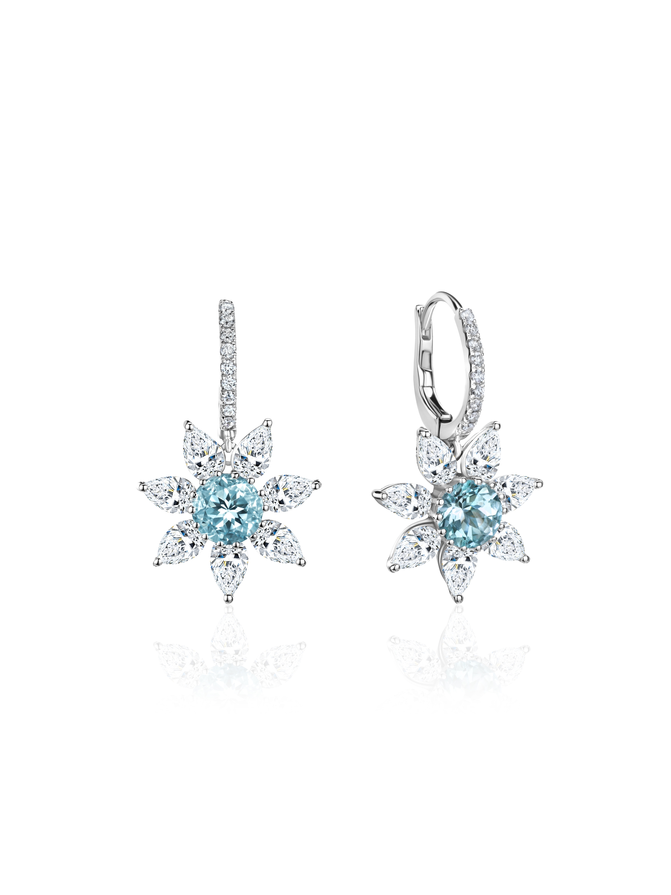 Earrings with 2 round aquamarines 1.92 ct, 14 pear-cut diamonds 2.57 ct and 18 round diamonds 0.16 ct. Item length: 2.5 cm.
