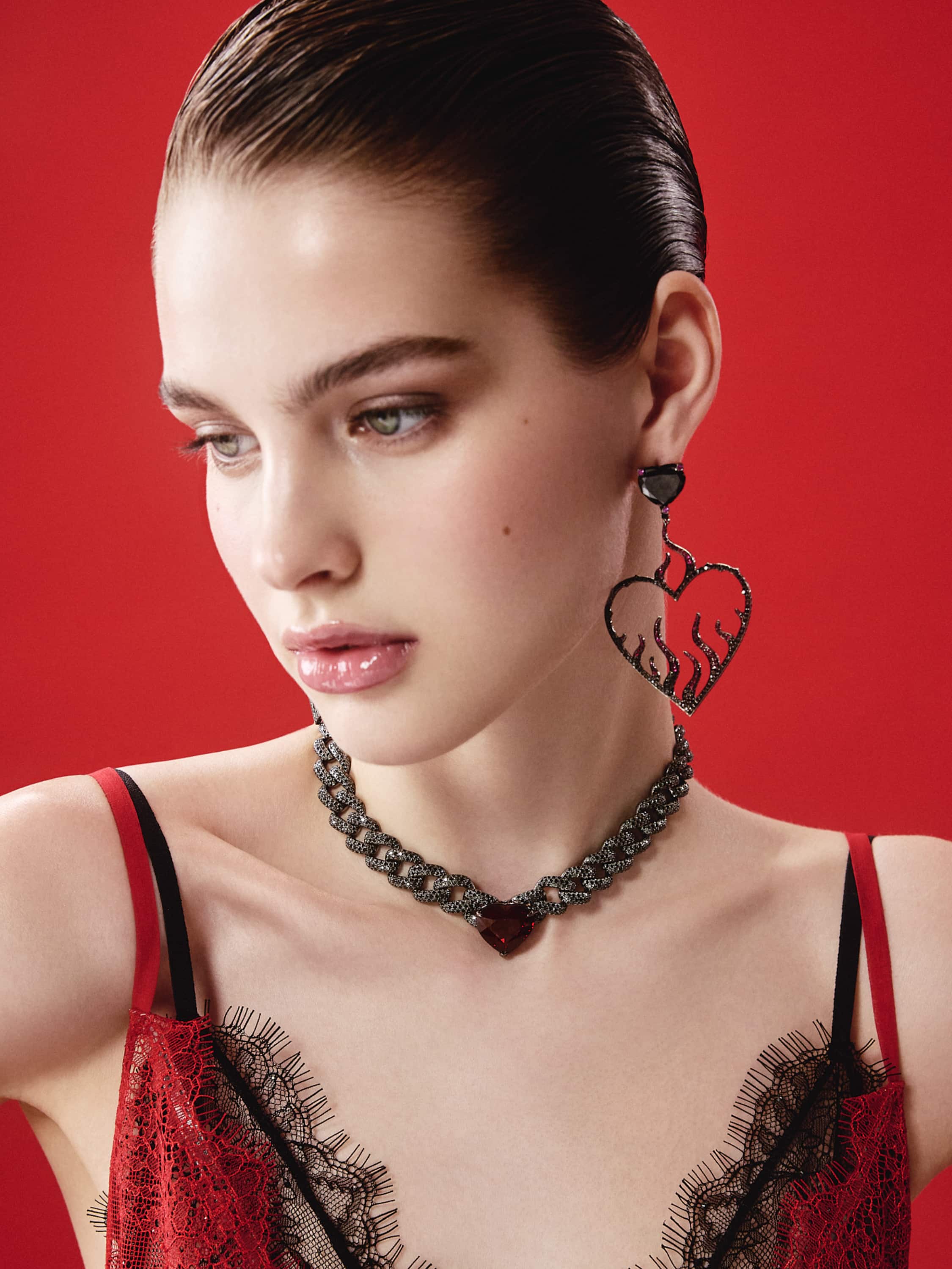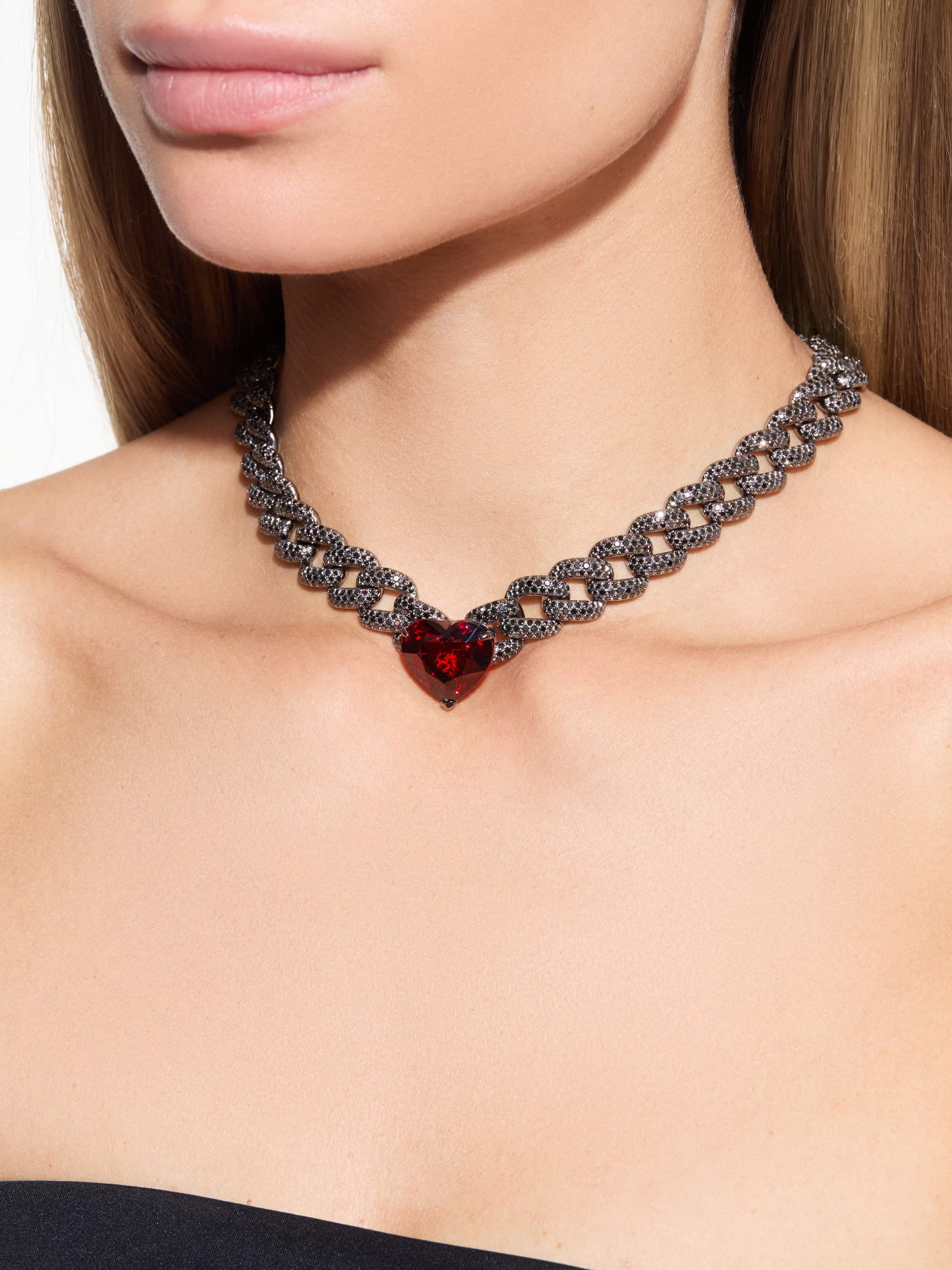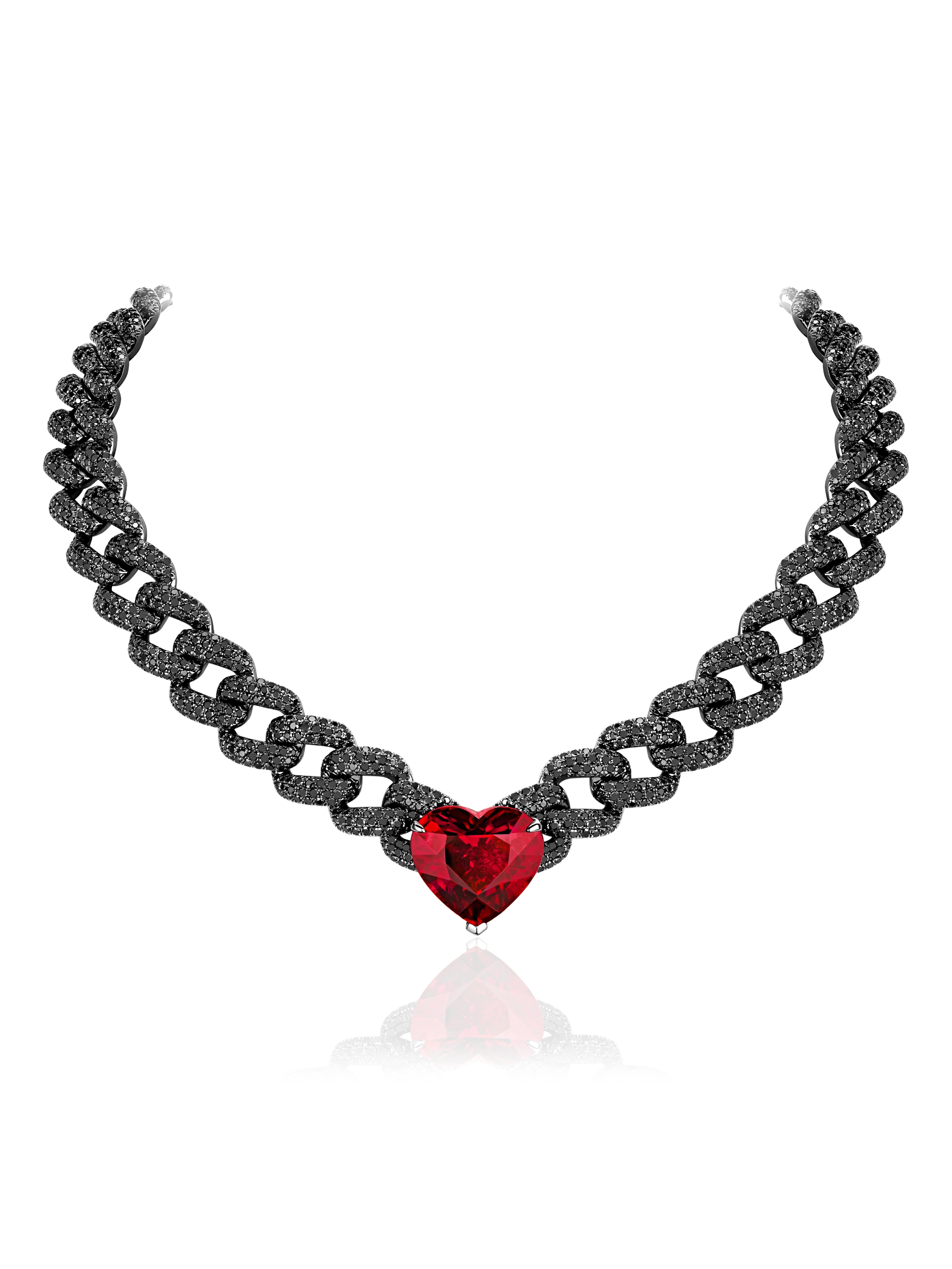 Blackened gold necklace with a heart-cut garnet weighing 30.82 ct and 2,286 black round-cut diamonds with a total weight of 23.17 ct.