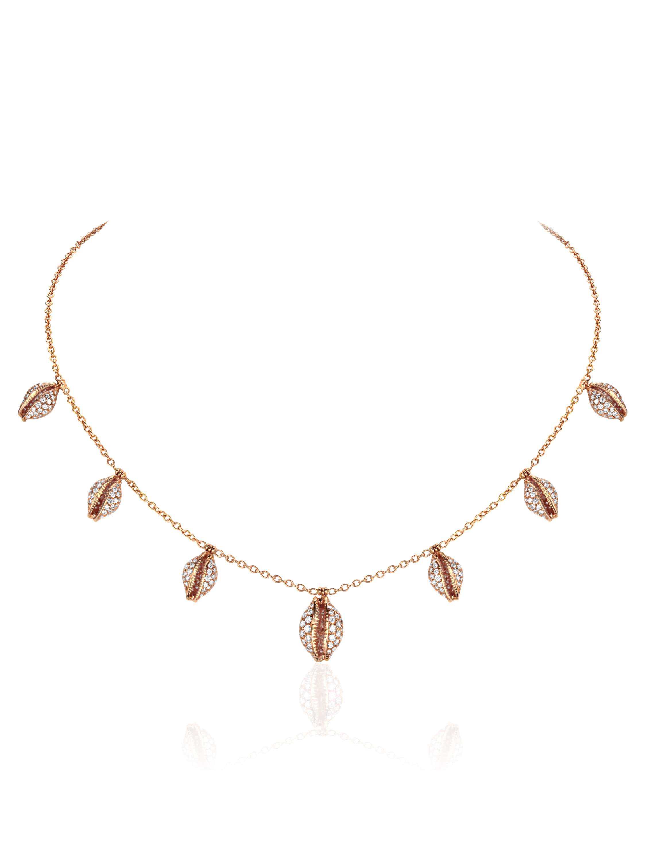 Rose gold necklace with shell-shaped pendants with 551 round diamonds weighing 8.08 ct, 50 round diamonds weighing 0.63 ct, and 1 diamond weighing 0.06 ct.