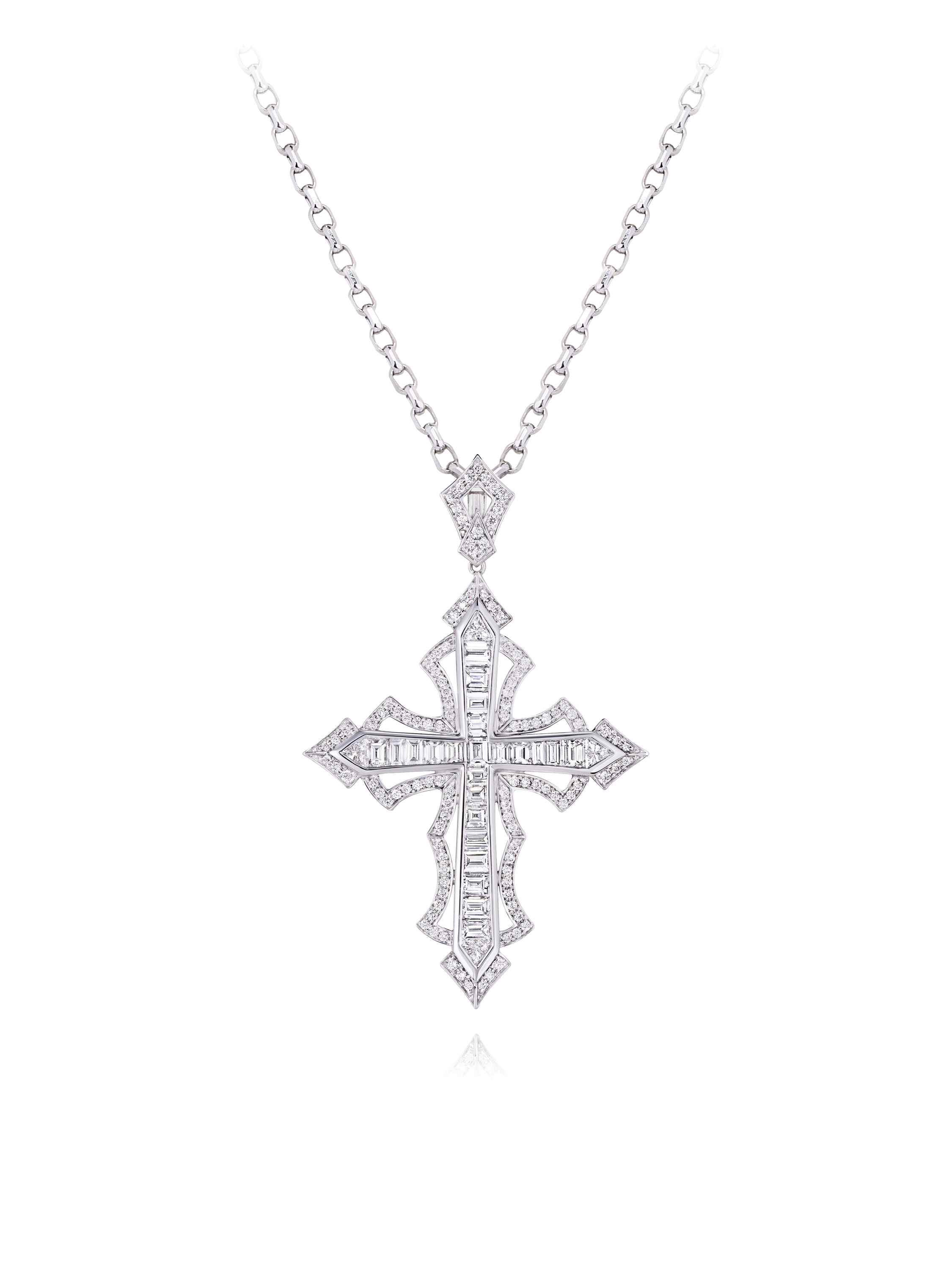 Necklace with a cross pendant in white gold with 200 round-cut diamonds with a total weight of 0.95 ct, 23 baguette-cut diamonds with a total weight of 2.4 ct, and 4 "fancy" cut diamonds with a total weight of 0.27 ct.
