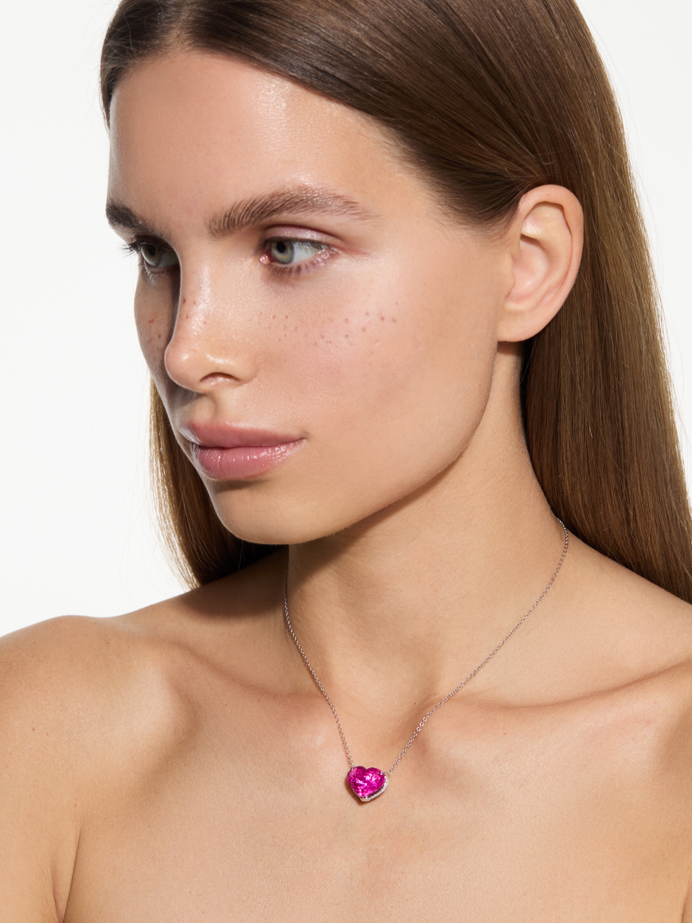 A necklace made of 18K white gold with a 10.95 ct heart-cut tourmaline, 107 round diamonds totaling 0.53 ct and 1 diamond in brilliant cut 0.10 ct.