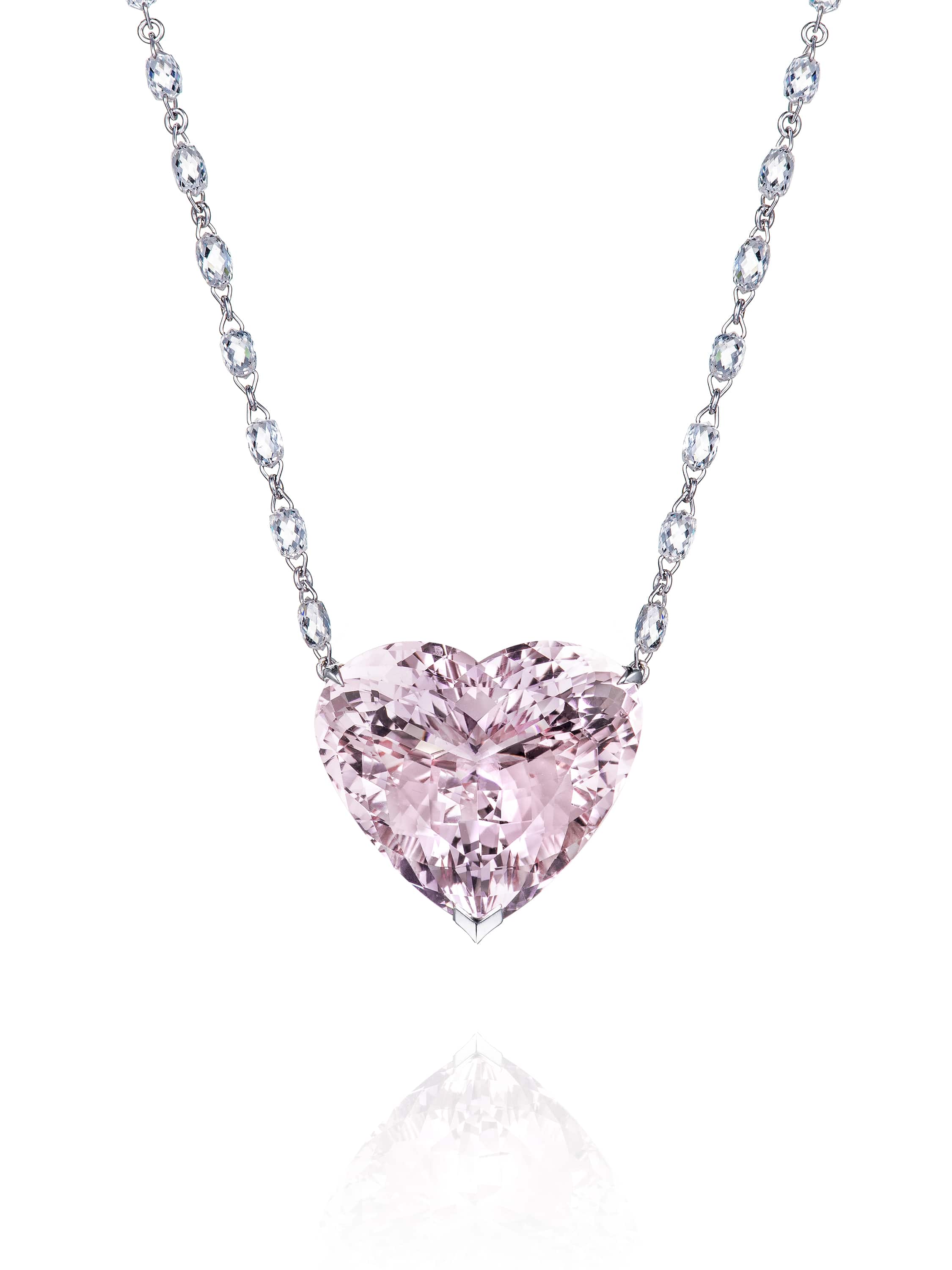 White gold necklace set with a heart-cut morganite weighing 14.64 ct, 169 round brilliant-cut diamonds with a total weight of 0.84 ct, and 60 briolette-cut diamonds with a total weight of 5.66 ct.