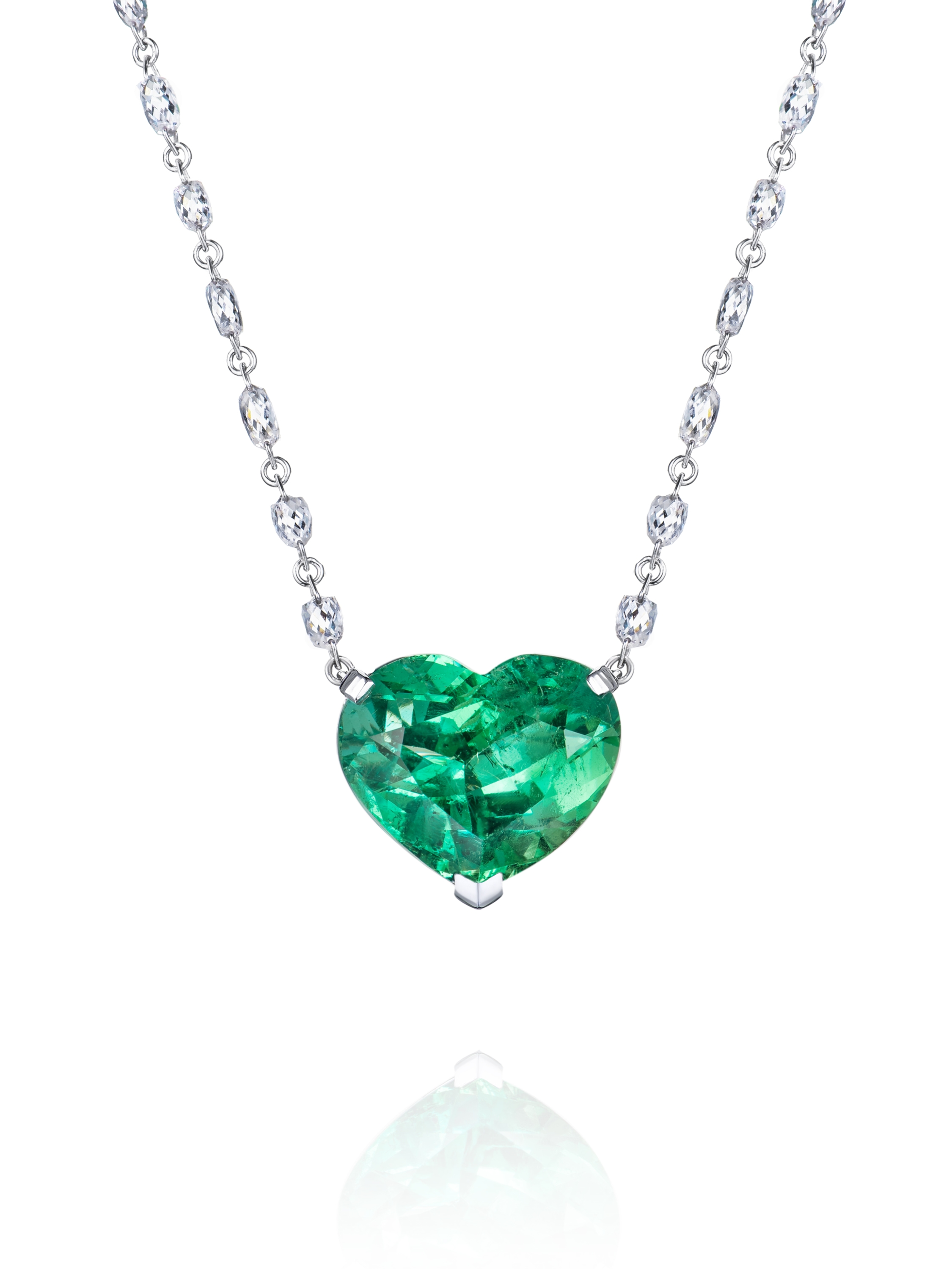 Necklace with a heart-cut emerald 5.52 ct, 96 round diamonds 0.47 ct, and 61 briolette-cut diamonds 5.73 ct.