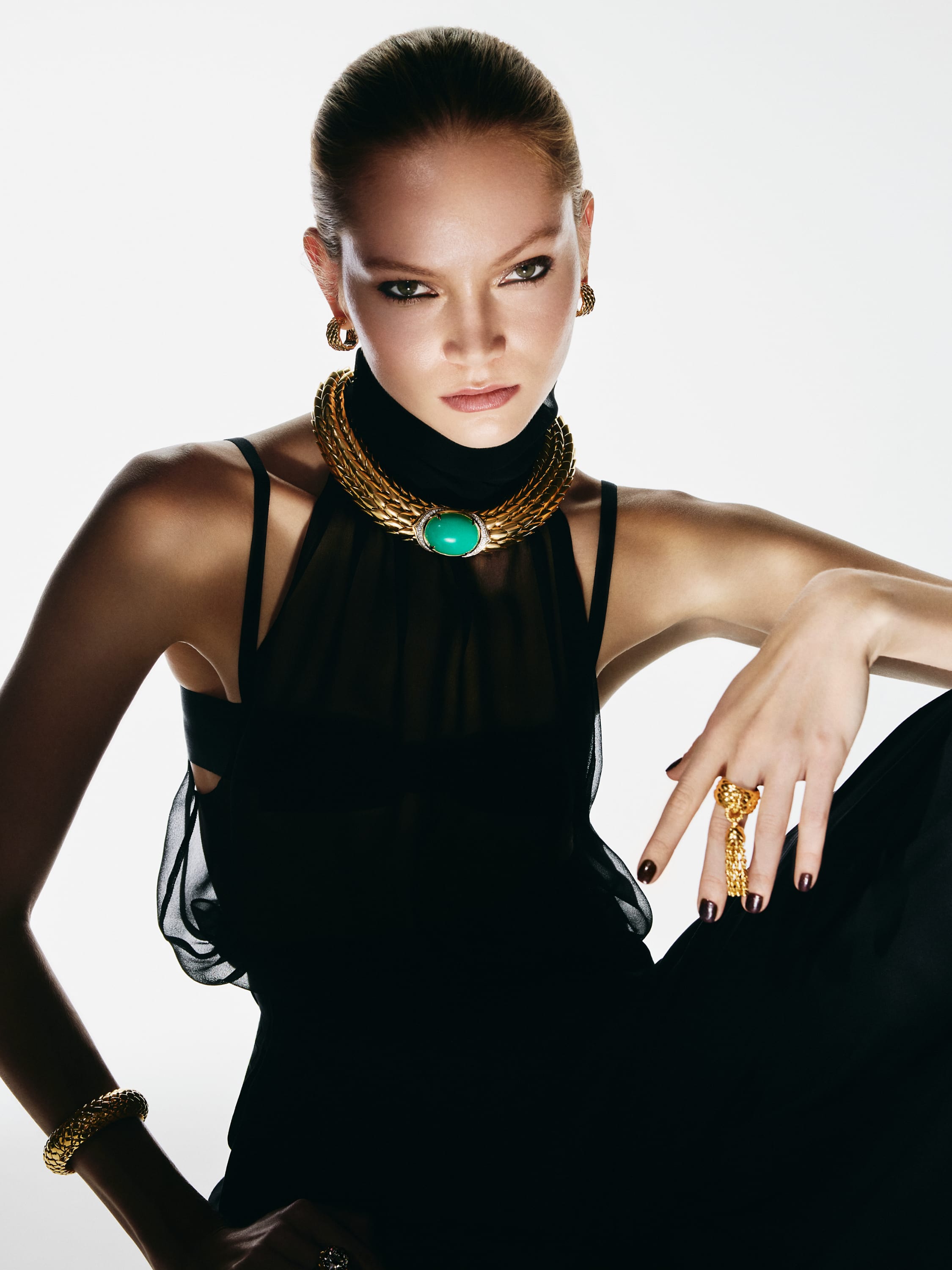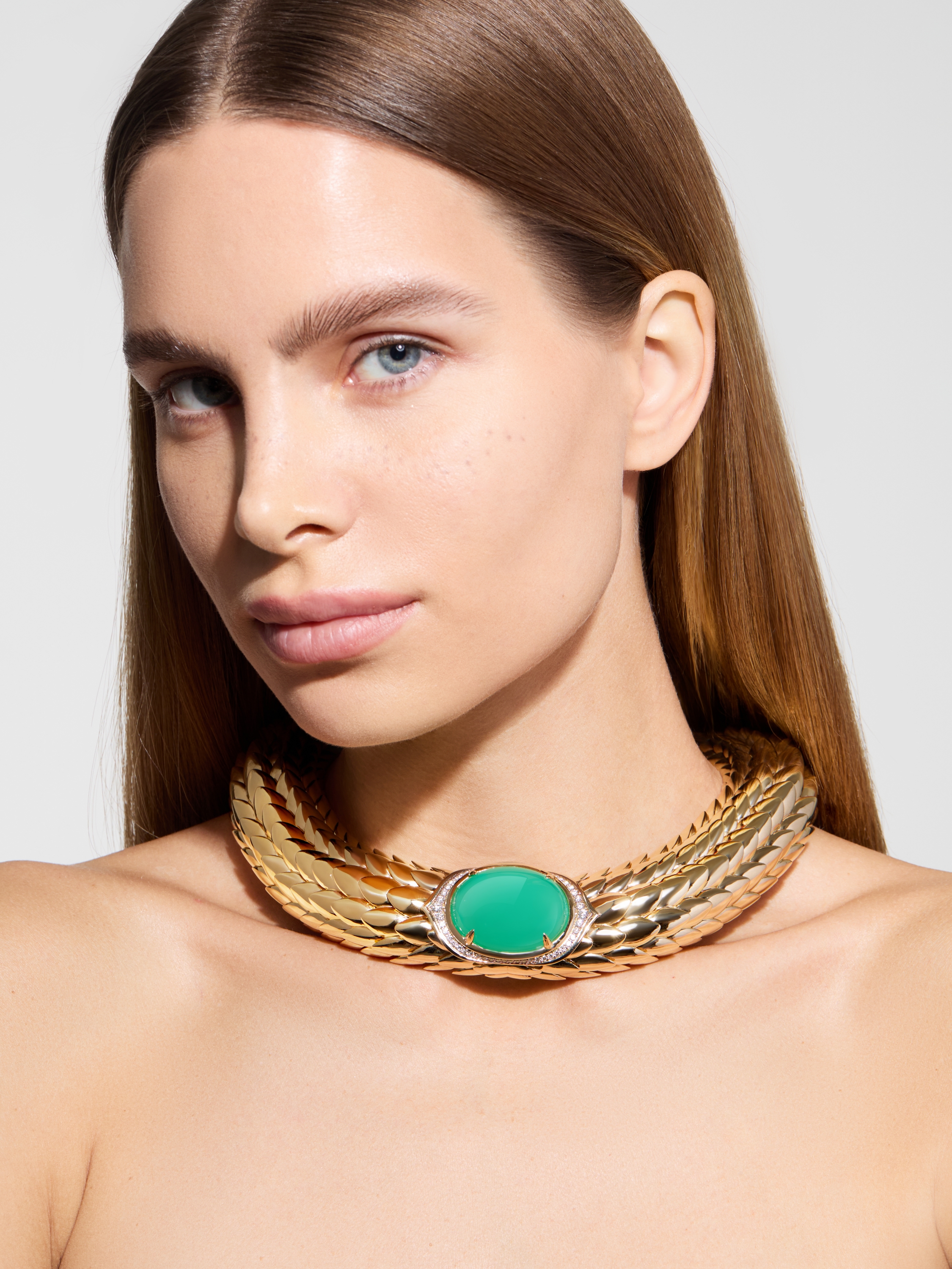 Necklace with oval-cut chrysoprase 69.23 ct and 54 round diamonds 1.64 ct.