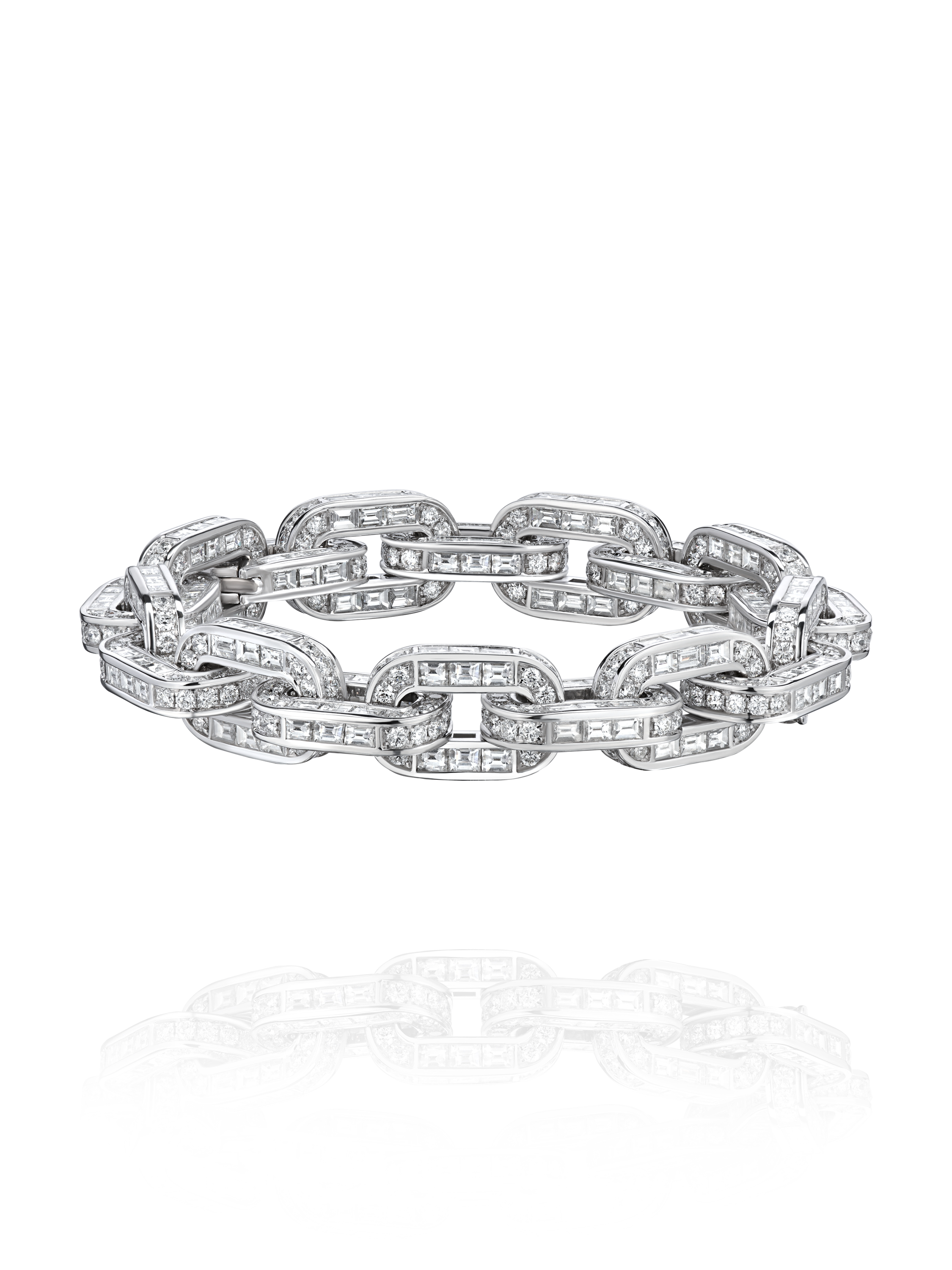 Bracelet in white gold, set with 324 baguette-cut diamonds with a total weight of 29.22 ct and 600 round-cut diamonds with a total weight of 17.68 ct.
