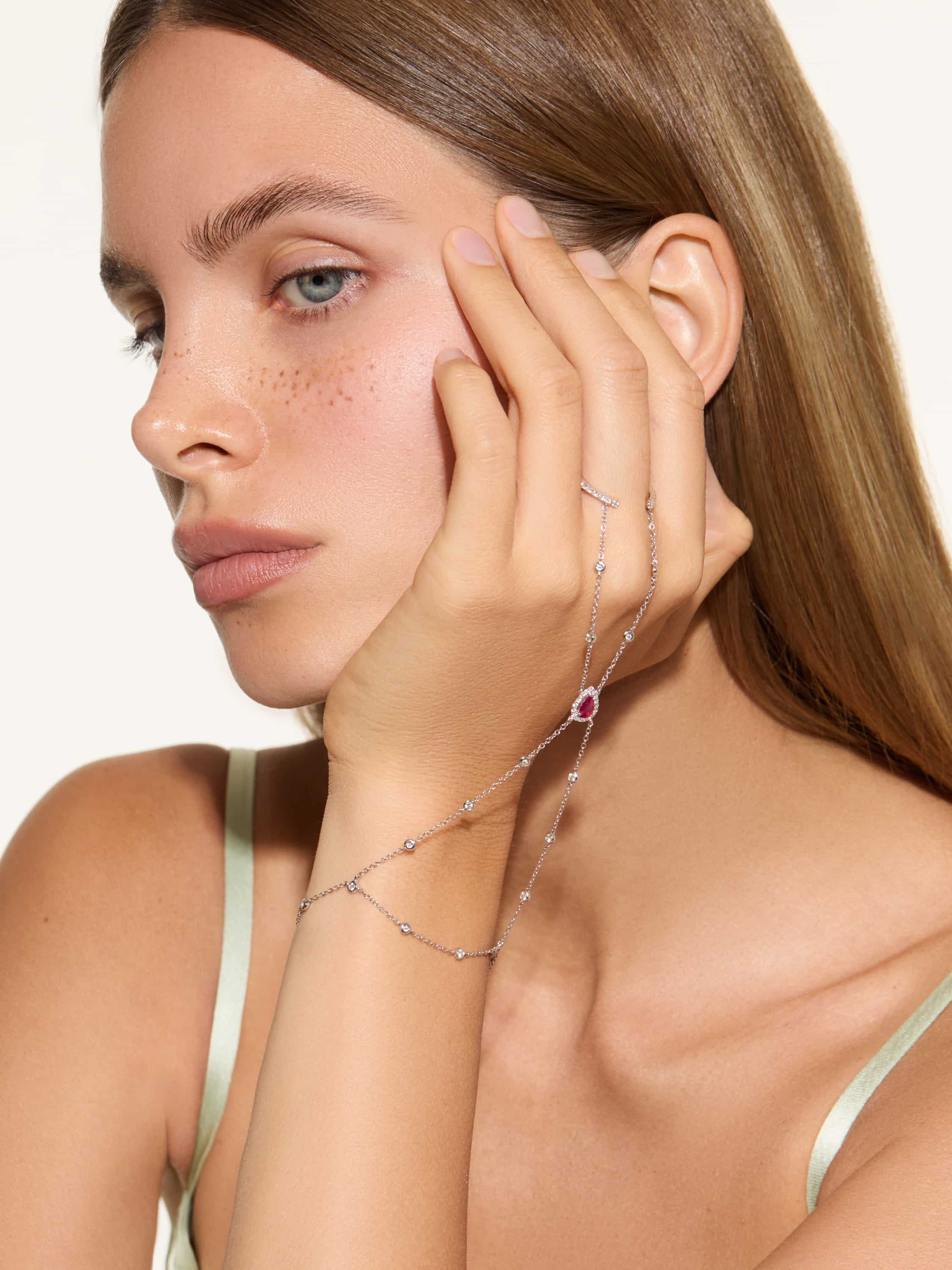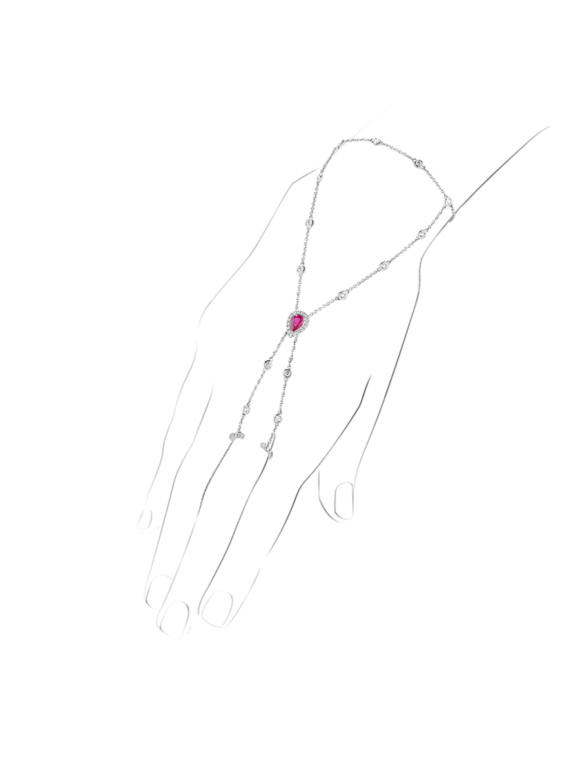 Slave bracelet in white gold with a pear-cut ruby weighing 0.49 ct, 66 round diamonds weighing 1.16 ct, and 12 round diamonds weighing 0.04 ct.