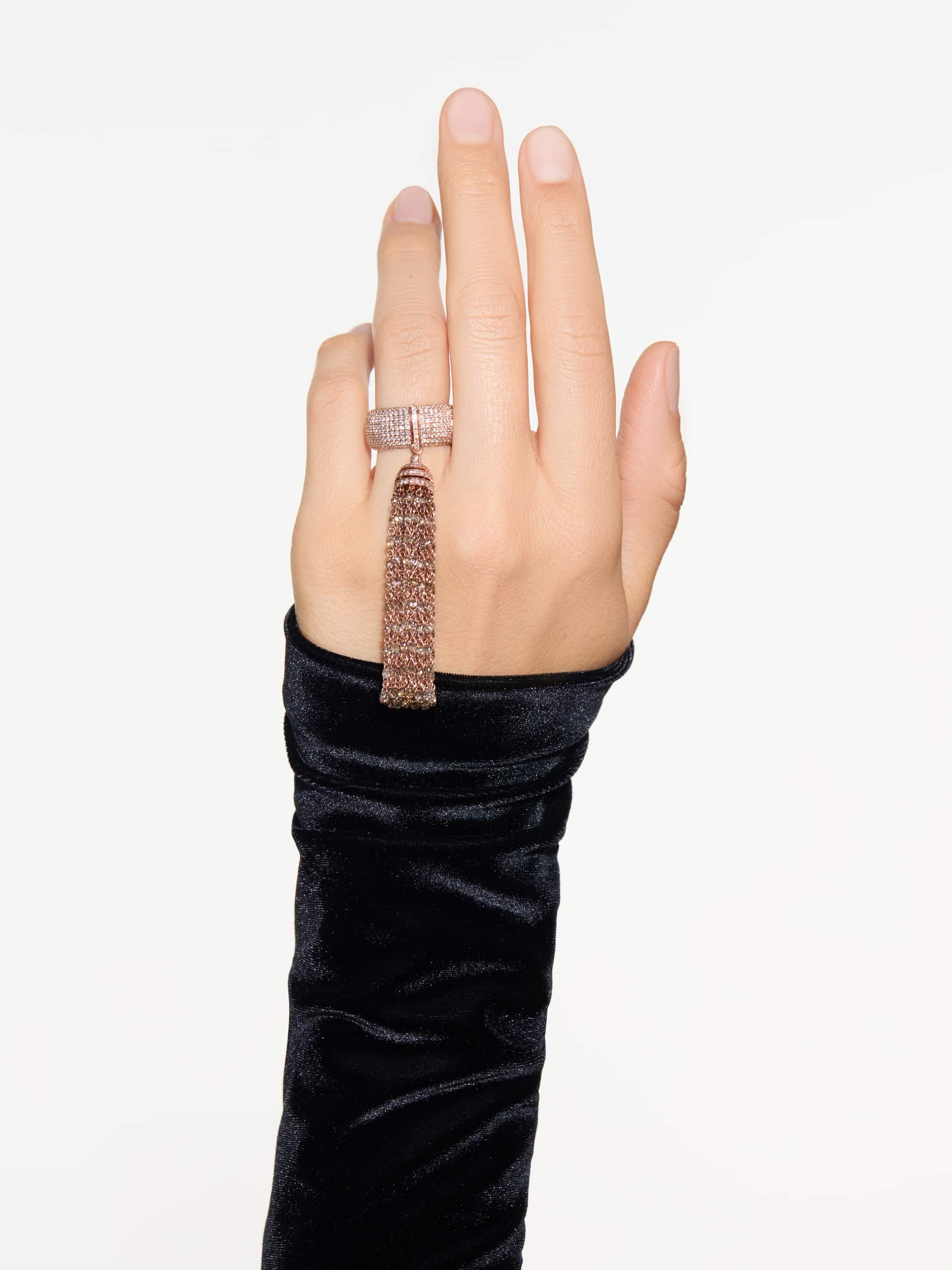 Rose gold ring with 250 brown diamonds weighing 15.23 ct and 554 round brown diamonds weighing 3.23 ct.