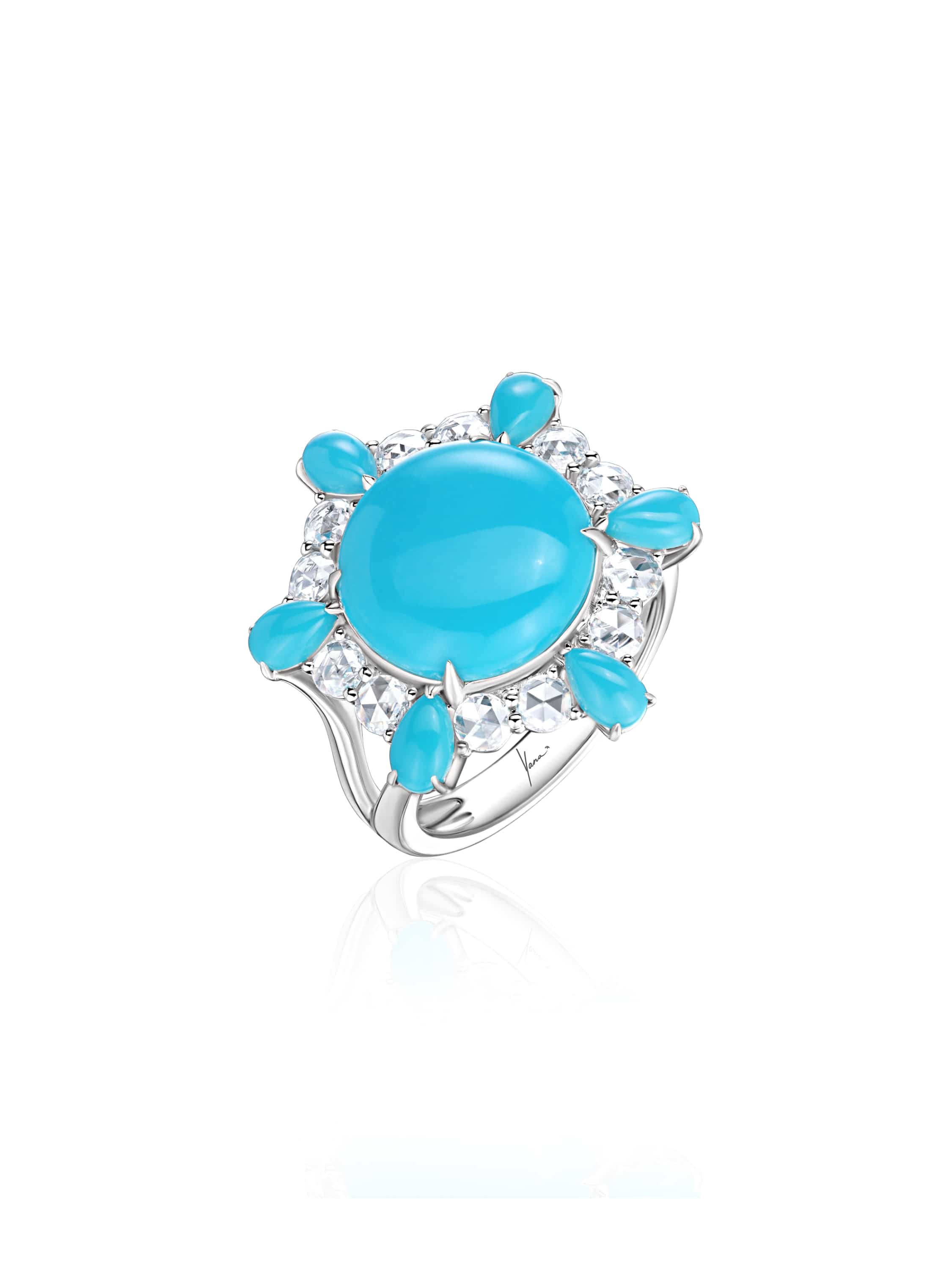 White gold ring with turquoise 0.72 g, pear-cut turquoise 0.27 g and 12 rose-cut diamonds 0.65 ct.