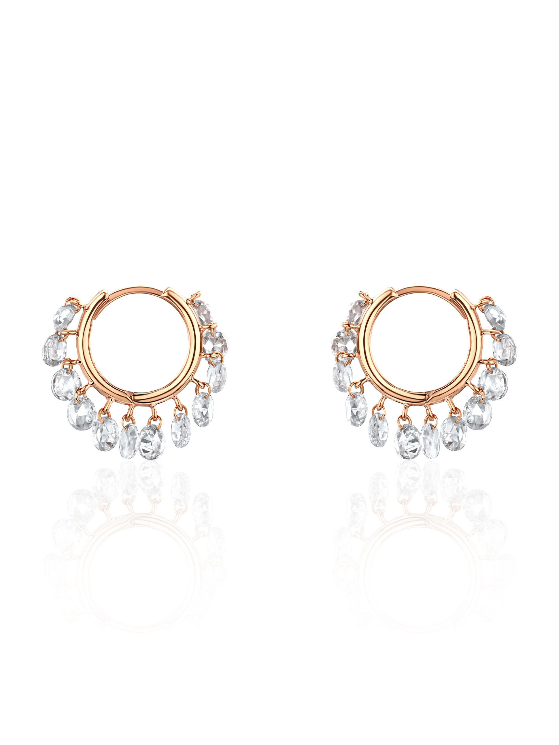 Hoop earrings in rose gold with 28 briolette-cut diamonds with a total weight of 1.32 ct. Diameter: 1 cm.