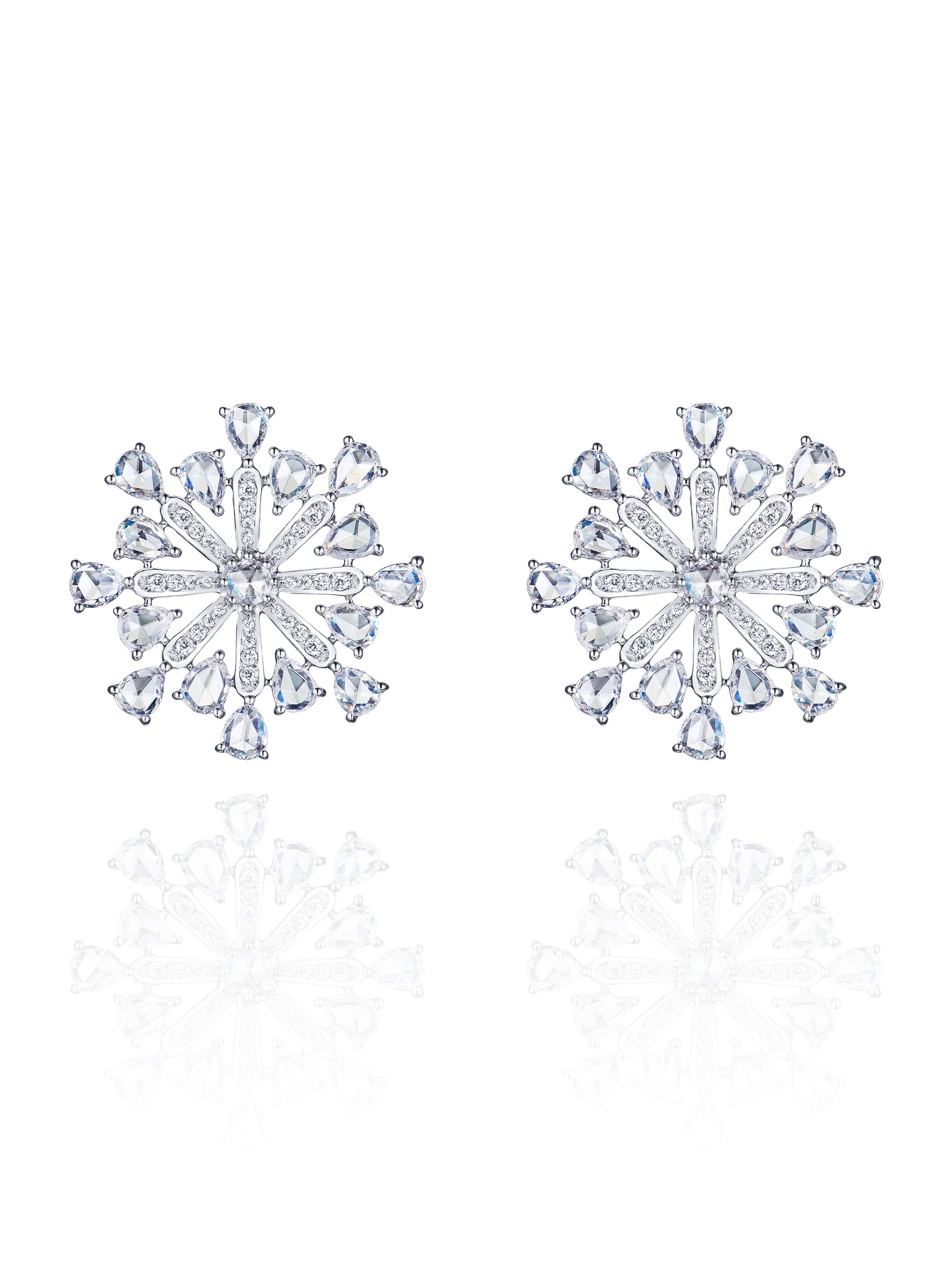 White gold stud earrings with 32 diamonds weighing 4.51 ct, 2 rose-cut diamonds weighing 0.13 ct, and 64 round diamonds weighing 0.33 ct.