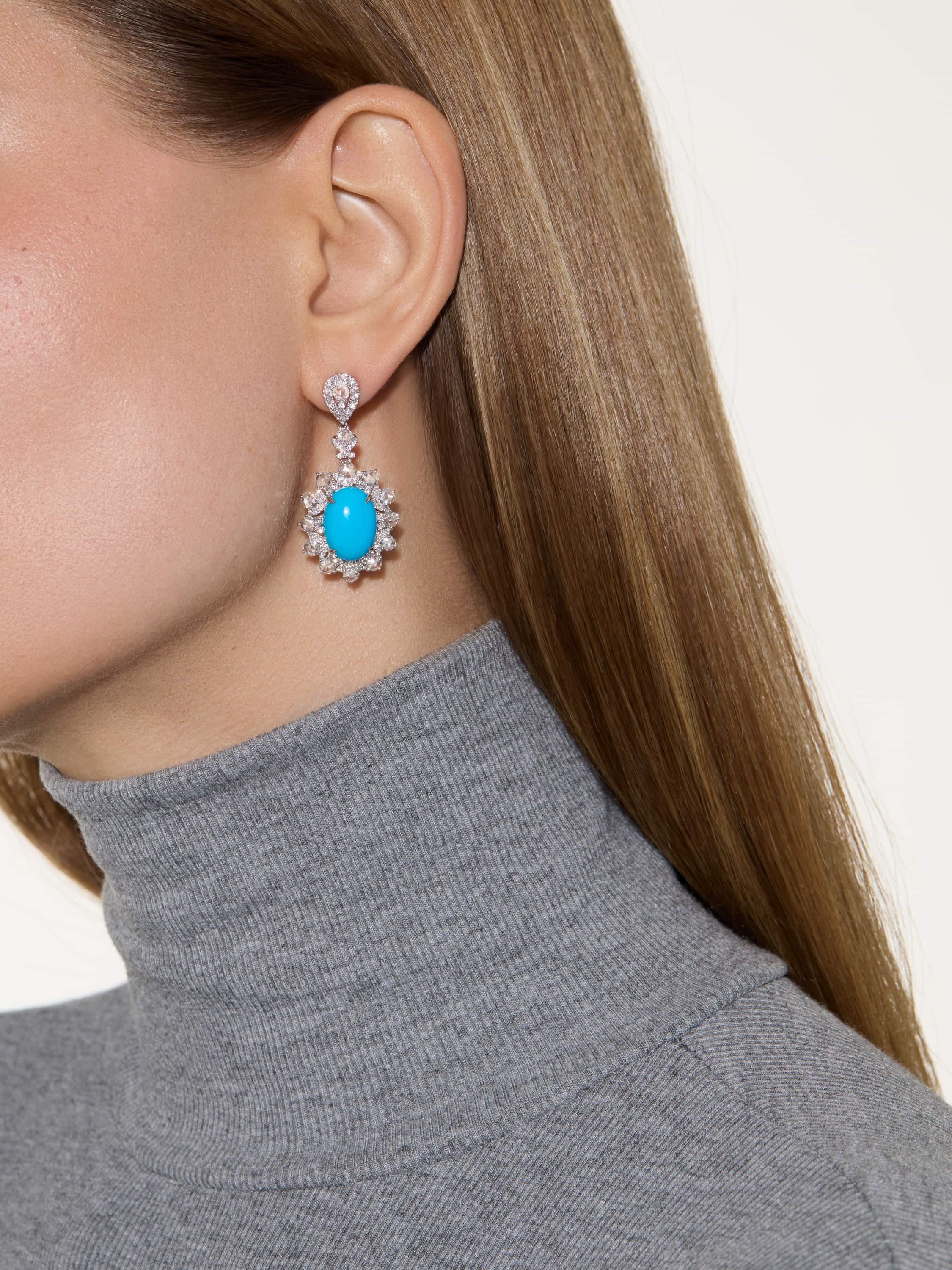 Long earrings in white gold with oval-cut turquoise weighing 9.17 ct, 28 fancy-cut diamonds 1.77 ct and 144 round-cut diamonds weighing 0.88 ct.