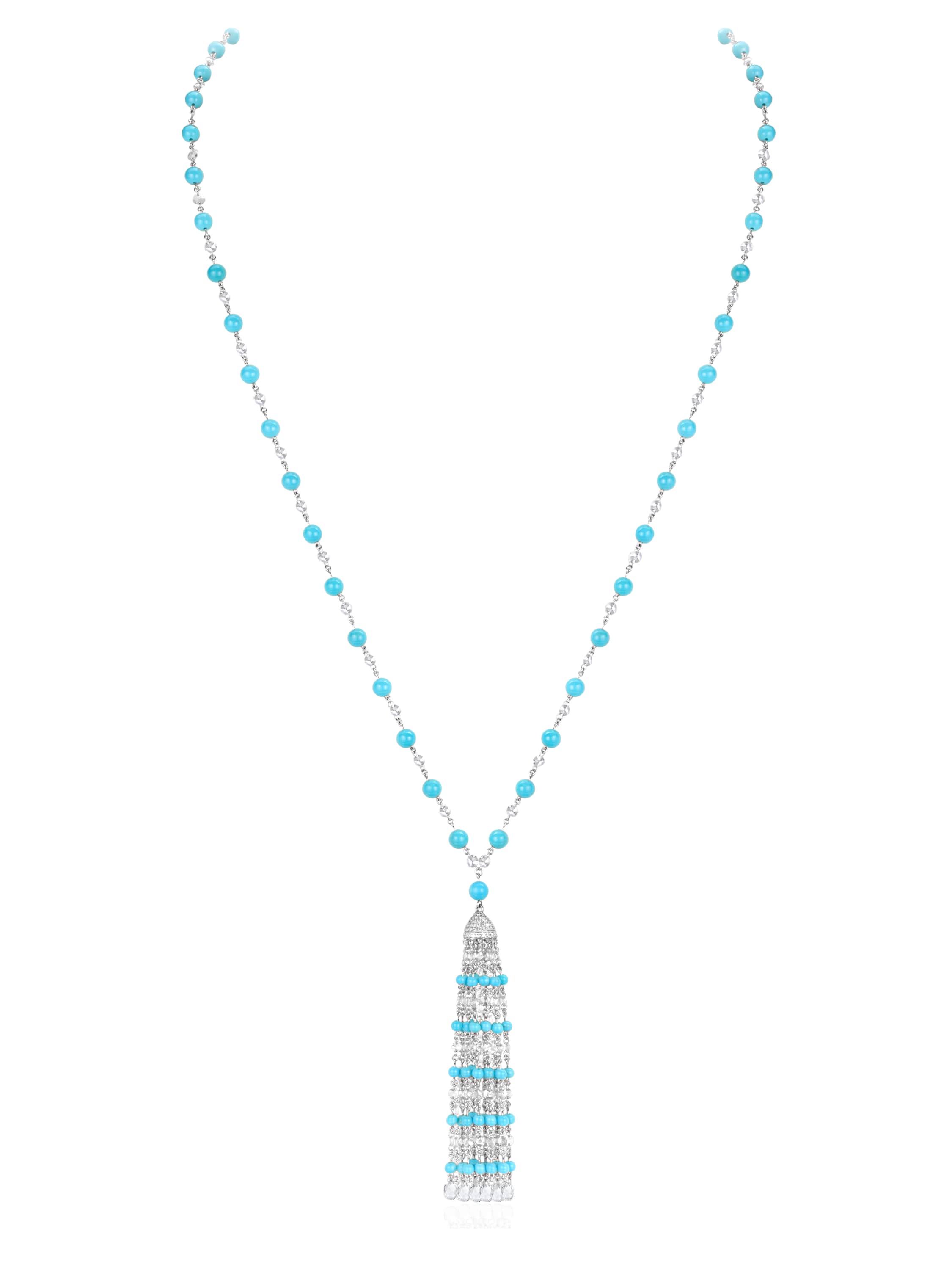 Necklace in white gold with a tassel pendant, 116 turquoise beads 6.51 g, 115 rose-cut diamonds weighing 3.82 ct, 10 pear-cut diamonds weighing 0.81 ct and 147 round diamonds weighing 0.53 ct.