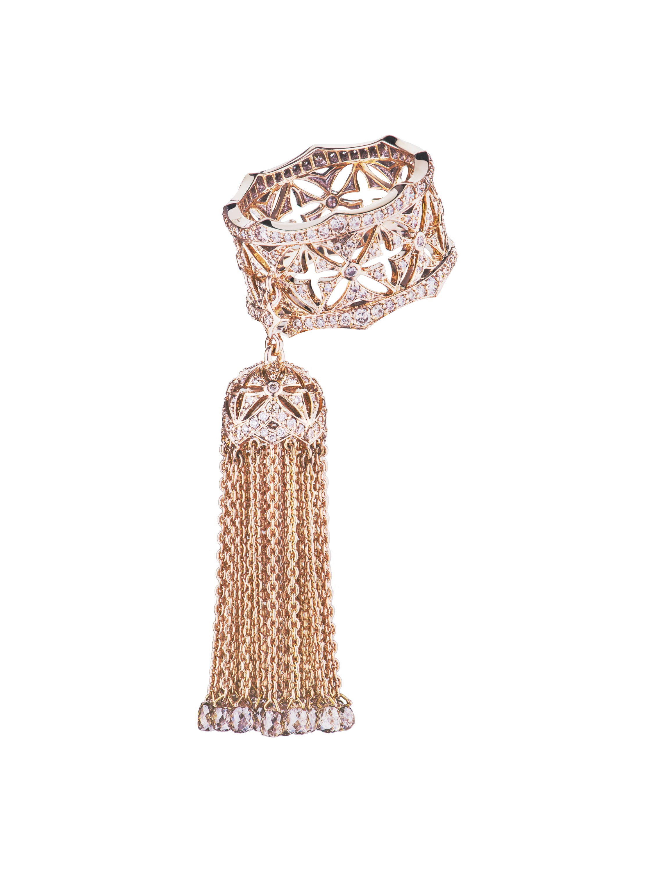 A hand ring made of 18K rose gold with 37 briolette-cut brown diamonds totaling 3.63 ct, and 253 round brown diamonds totaling 1.07 ct
