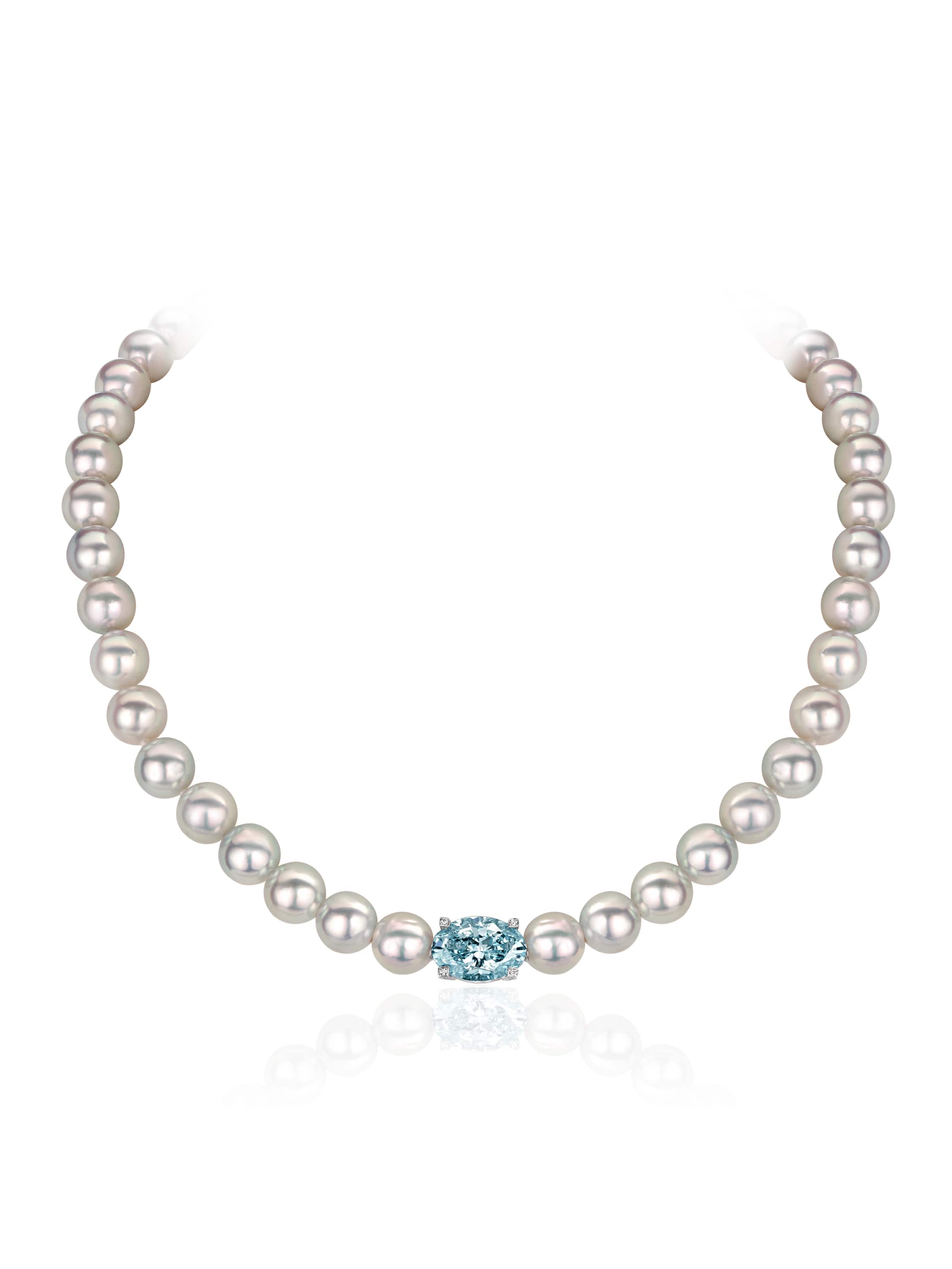 Necklace with a blue LG diamond in an oval cut 5.17 ct LG FB/VS2, 44 grey Akoya pearls with a rare pink-blue overtone 222.66 ct d 8.5-9.00, 167 round LG diamonds 0.72 ct H/SI.