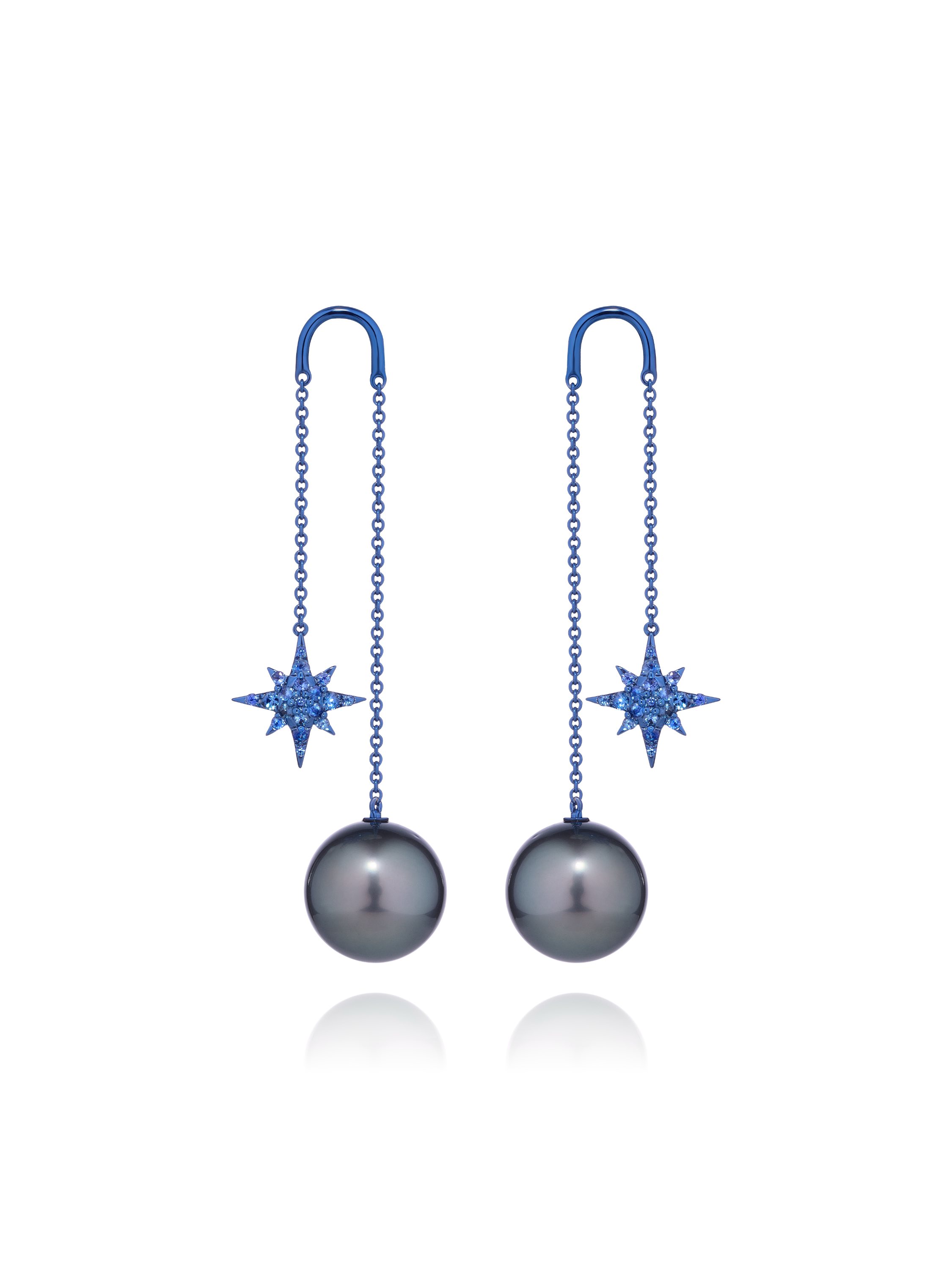 Earrings made of blackened gold with pearls and round sapphires