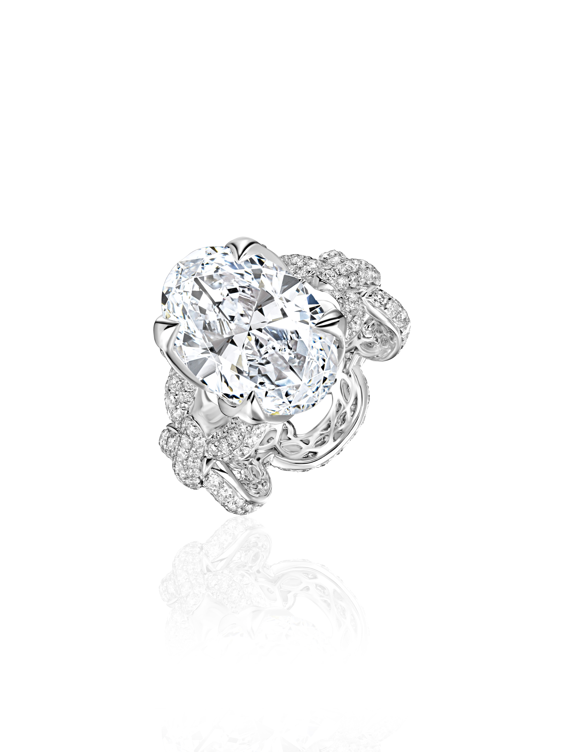 White gold ring with an 8.01 ct E/VS1 oval lab-grown diamond and 306 round lab-grown diamonds totaling 3.20 ct H/SI.
