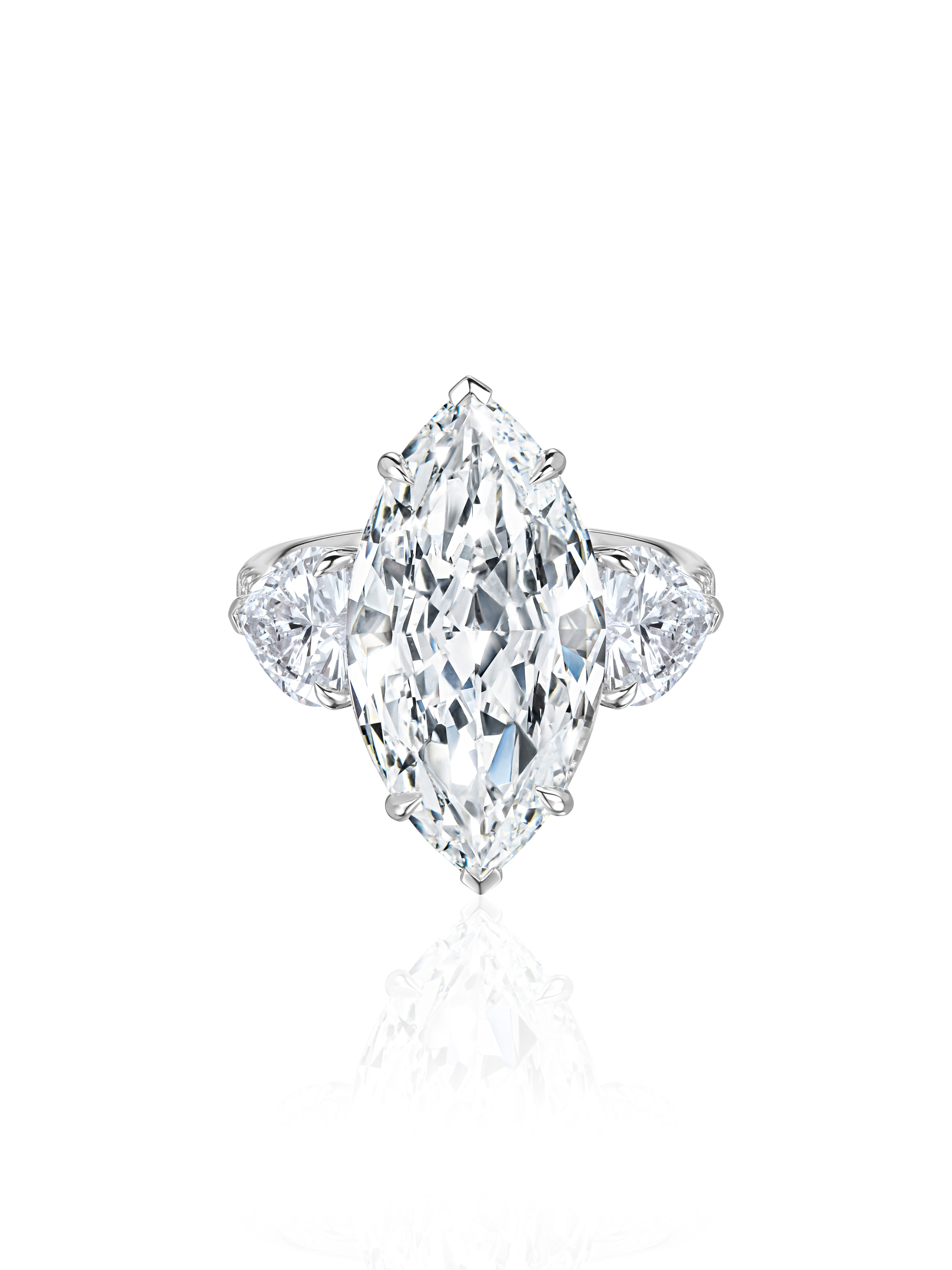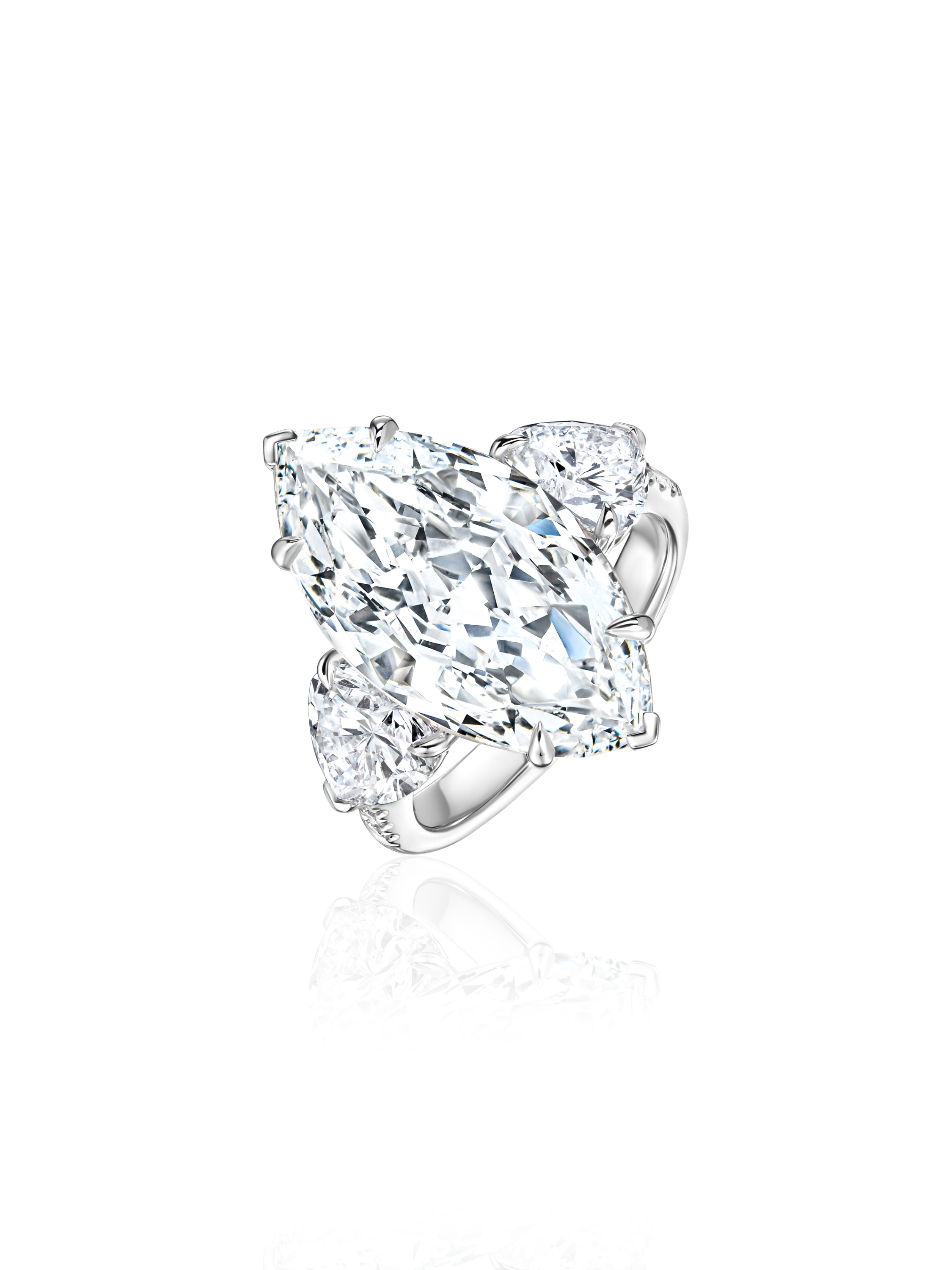 White gold ring with a 0.07 ct F/VS2 lab-grown marquise-cut diamond, one 1.03 ct E/VS1 lab-grown heart-cut diamond, one 1.03 ct E/VS2 lab-grown heart-cut diamond, and eight round lab-grown diamonds totaling 0.10 ct. Total diamond weight: 12.23 ct.