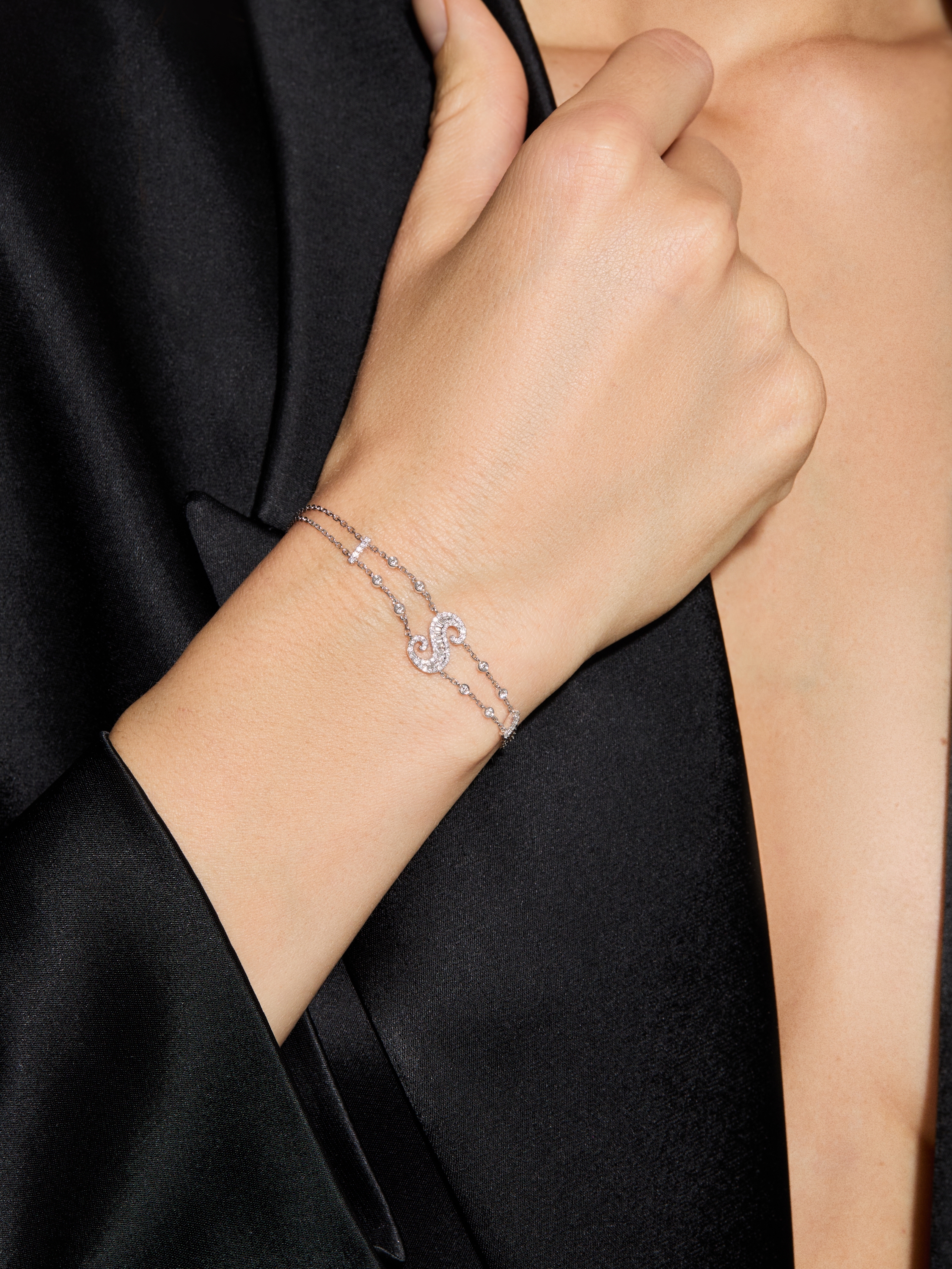 “S” bracelet in white gold with 13 baguette-cut diamonds with a total weight of 0.07 ct and 63 round-cut diamonds with a total weight of 0.29 ct.