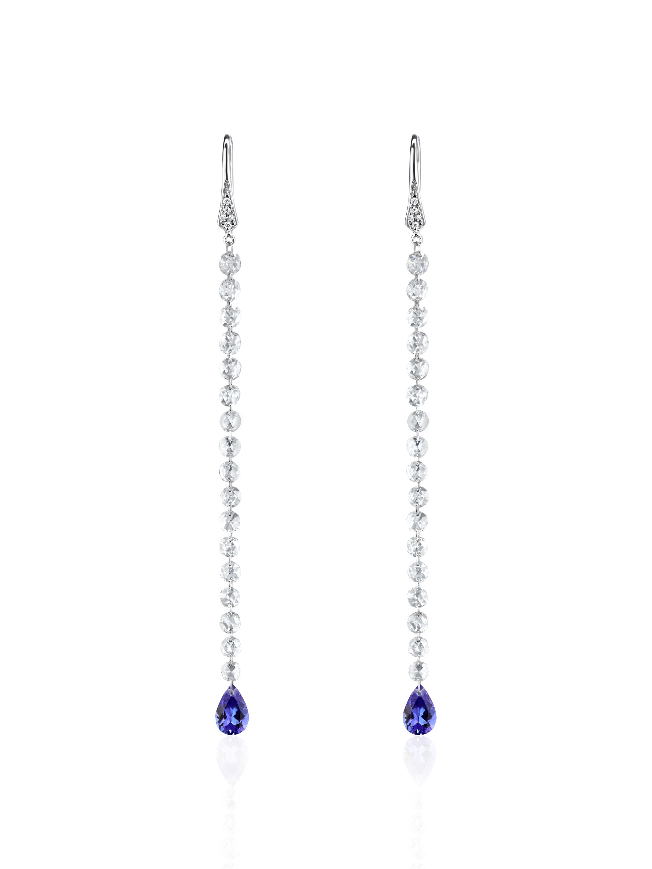 Earrings made of 750 white gold with 2 pear-cut tanzanites weighing 0.66 ct, 10 round diamonds weighing 0.04 ct, and 34 rose-cut diamonds weighing 1.35 ct. Item length: 7 cm.