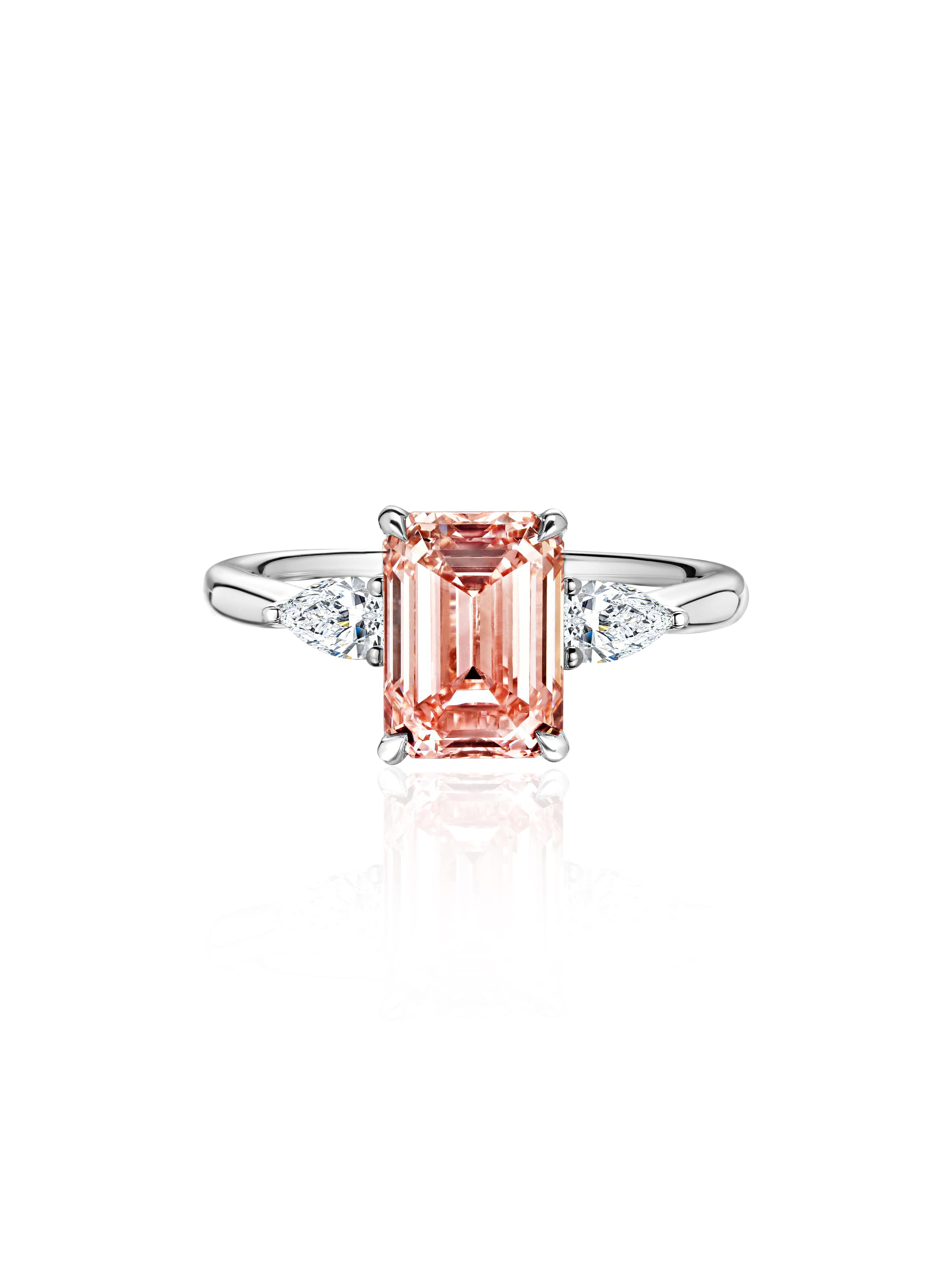 White gold ring with pink LG diamond in octagon cut 3.03 ct FVP/VVS2 and 2 LG diamonds in pear cut 0.41 ct H/SI.