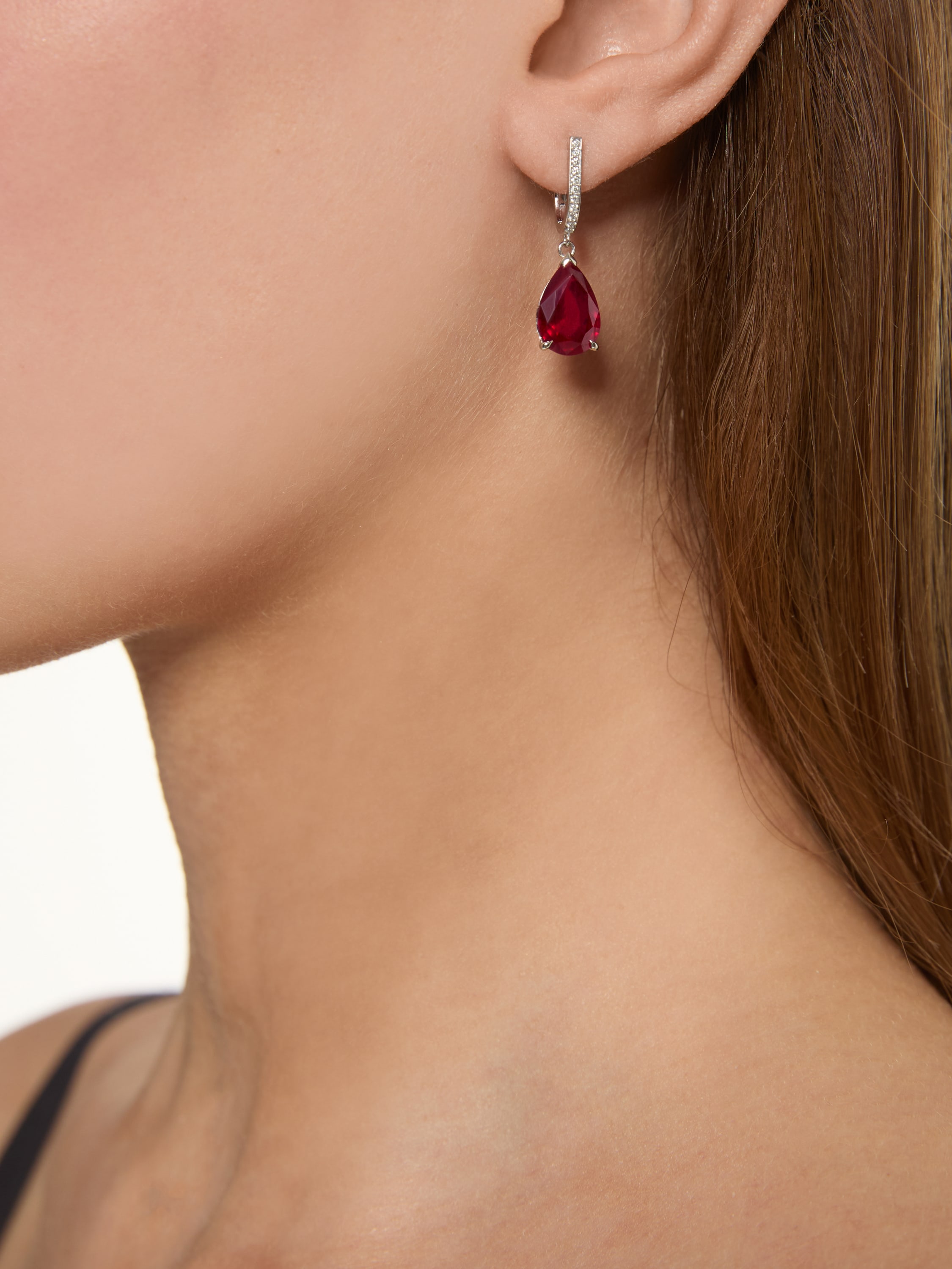 Asymmetric white gold earrings with 1 pear‑cut ruby weighing 4.57 ct and 56 round diamonds weighing 0.28 ct. The arrow‑shaped earring is 4 cm long, the earring with ruby and diamonds is 2.5 cm.