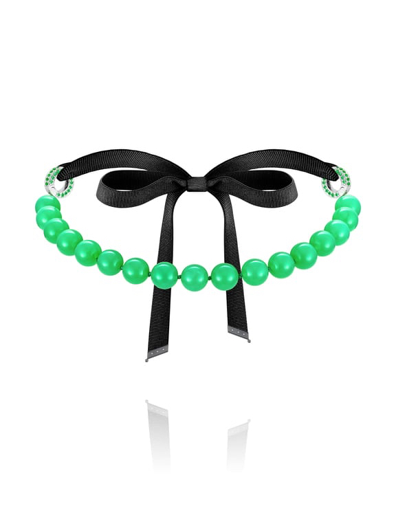 The transformer piece can be worn in two ways: as a bracelet and as a choker. The piece is made of white gold on a black ribbon with 17 chrysoprase beads with a total weight of 20.19 g and 72 emeralds with a total weight of 1.11 ct. Bead diameter: 9 mm.