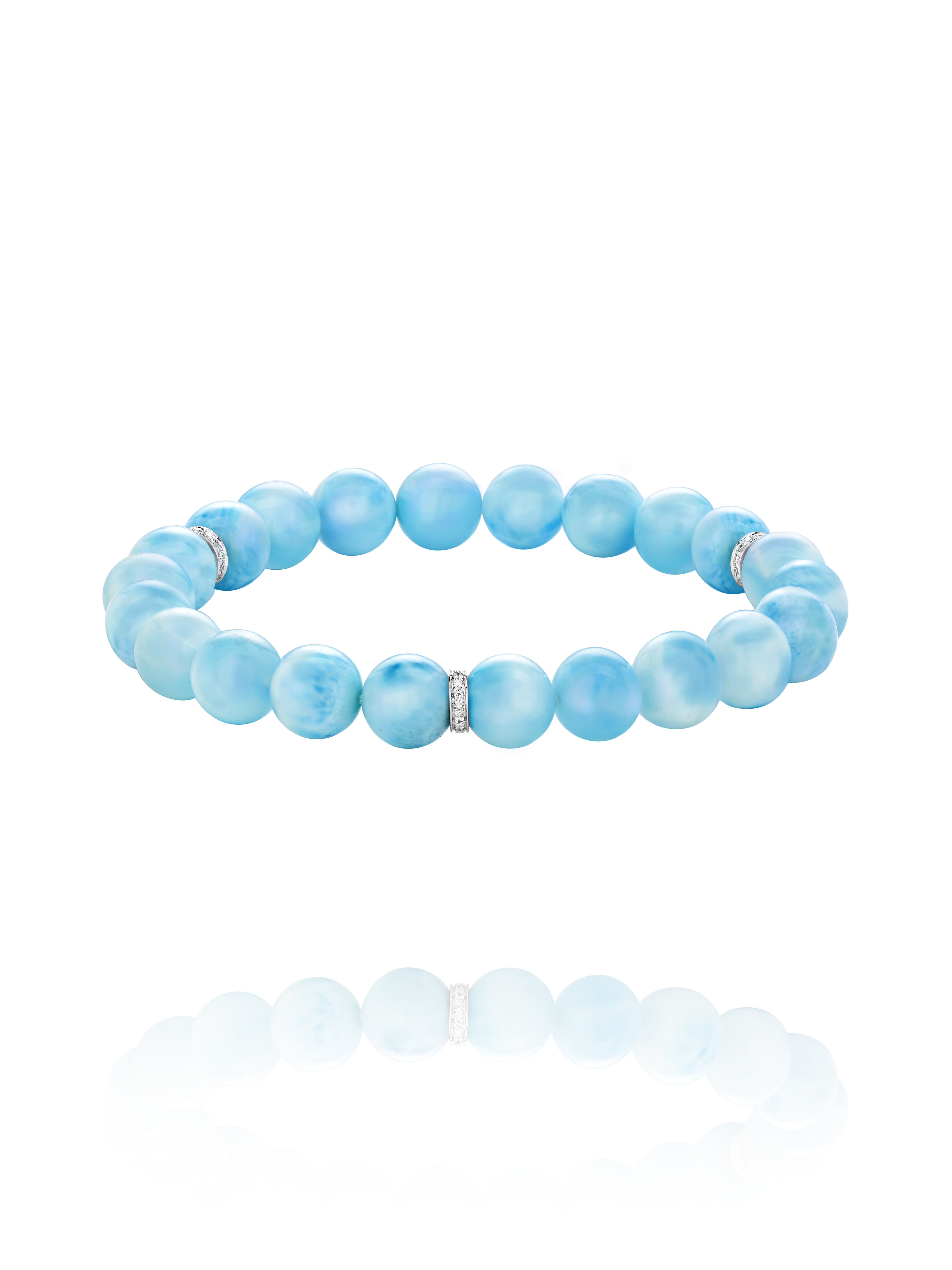 White gold bracelet with 18 larimar beads with a total weight of 28.62 g and a diameter of 12 mm, and 45 round-cut diamonds with a total weight of 0.14 ct.