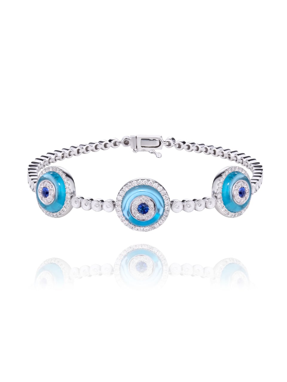 Bracelet in white gold, inlaid with 162 round diamonds with a total weight of 0.89 ct, 3 blue quartzes with a total weight of 5.80 ct, and 3 round sapphires with a total weight of 0.32 ct.