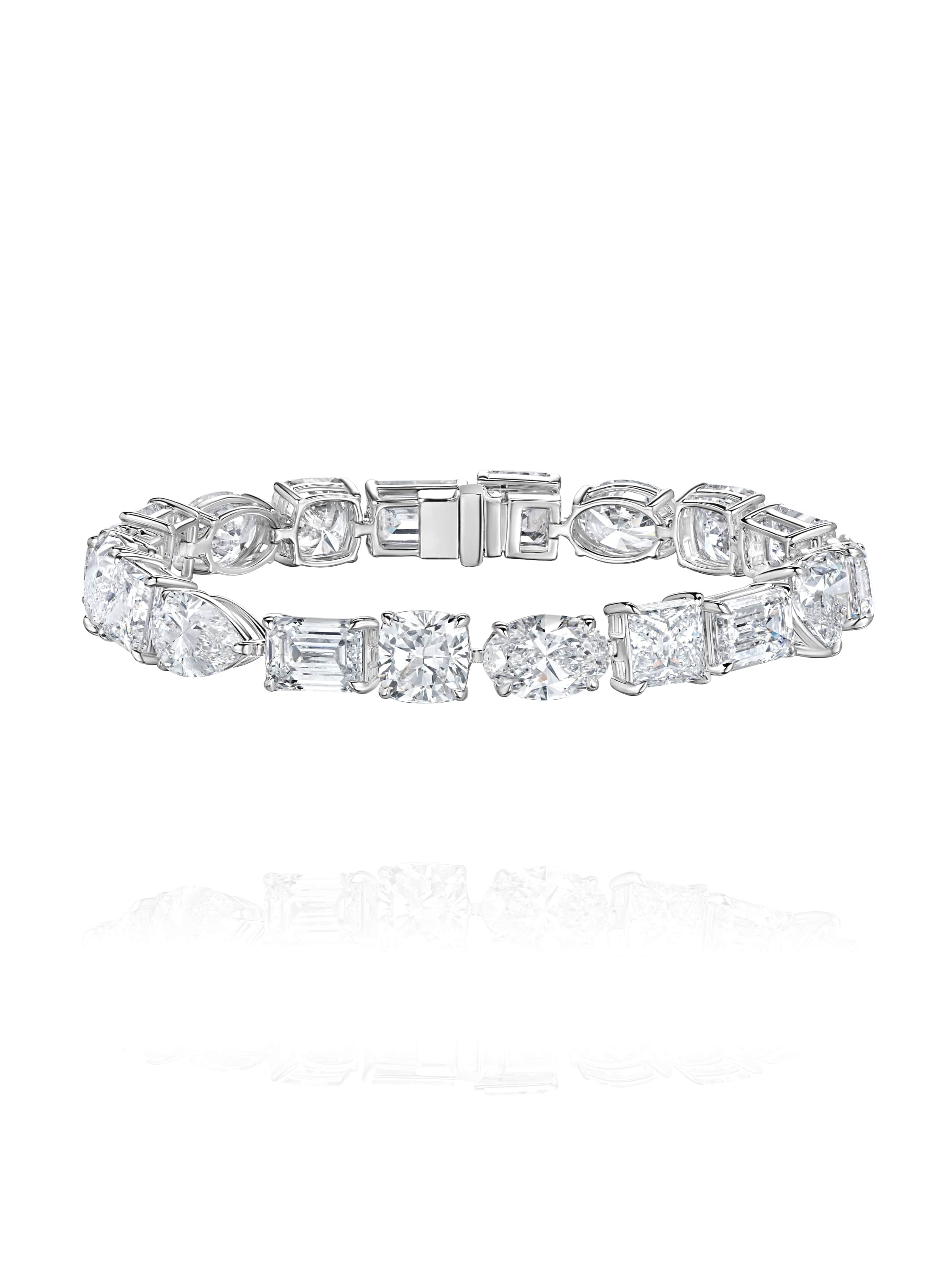 White gold bracelet with 3 LG cushion-cut diamonds 6.27 ct F/VS1, 5 LG Emerald Cut diamonds 10.44 ct E/VS1, 2 LG heart-cut diamonds weighing 4.19 ct, 3 oval LG diamonds 6.27 ct E/VS1, 3 LG princess-cut diamonds 6.09 ct E/VVS2, 2 LG pear-cut diamonds 4.18 ct F/VS2, and 2 round LG diamonds 4.04 ct E/VS1.