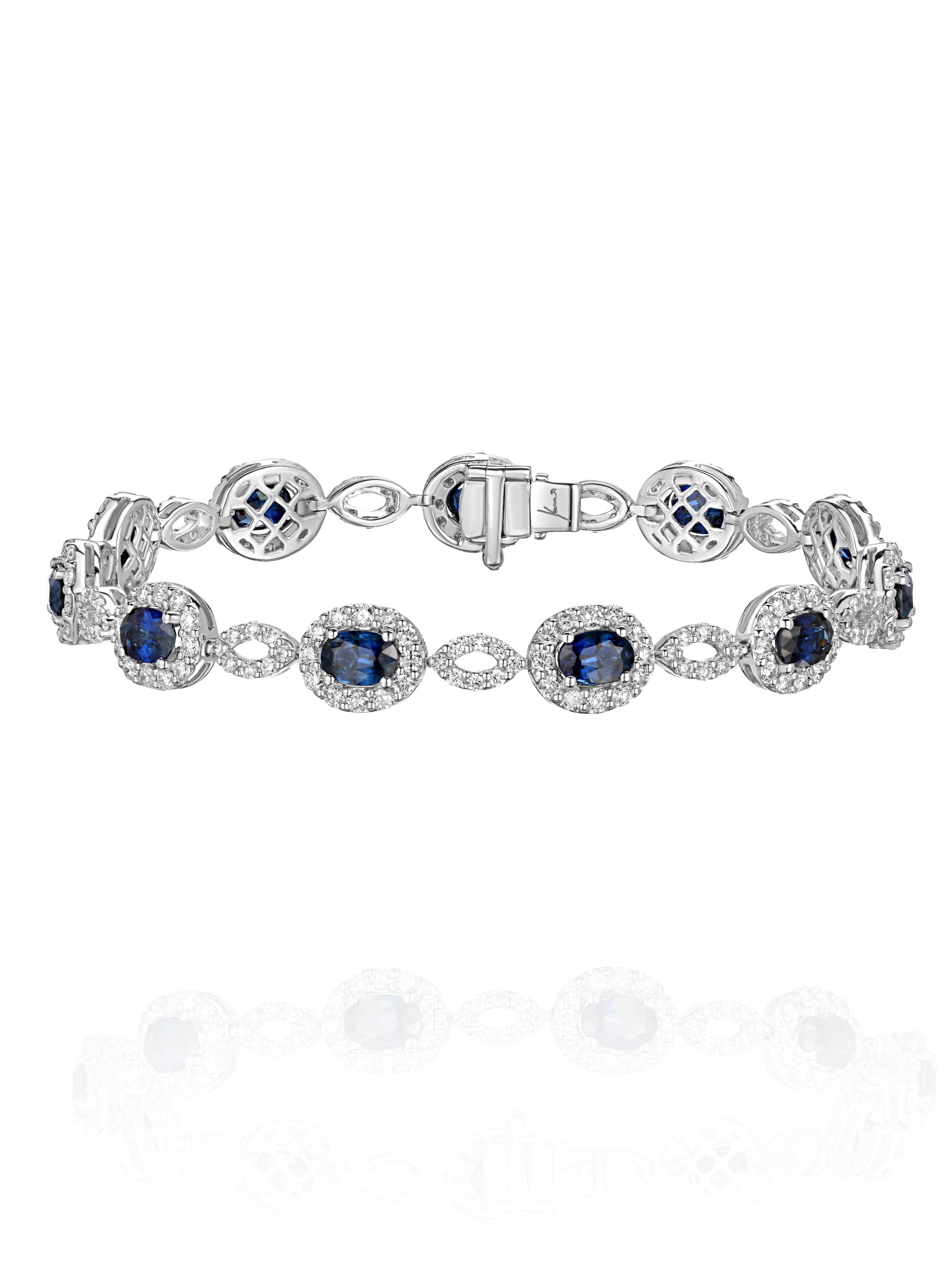 White gold bracelet with 11 oval sapphires weighing 6.73 ct and 221 round-cut diamonds weighing 3.26 ct.
