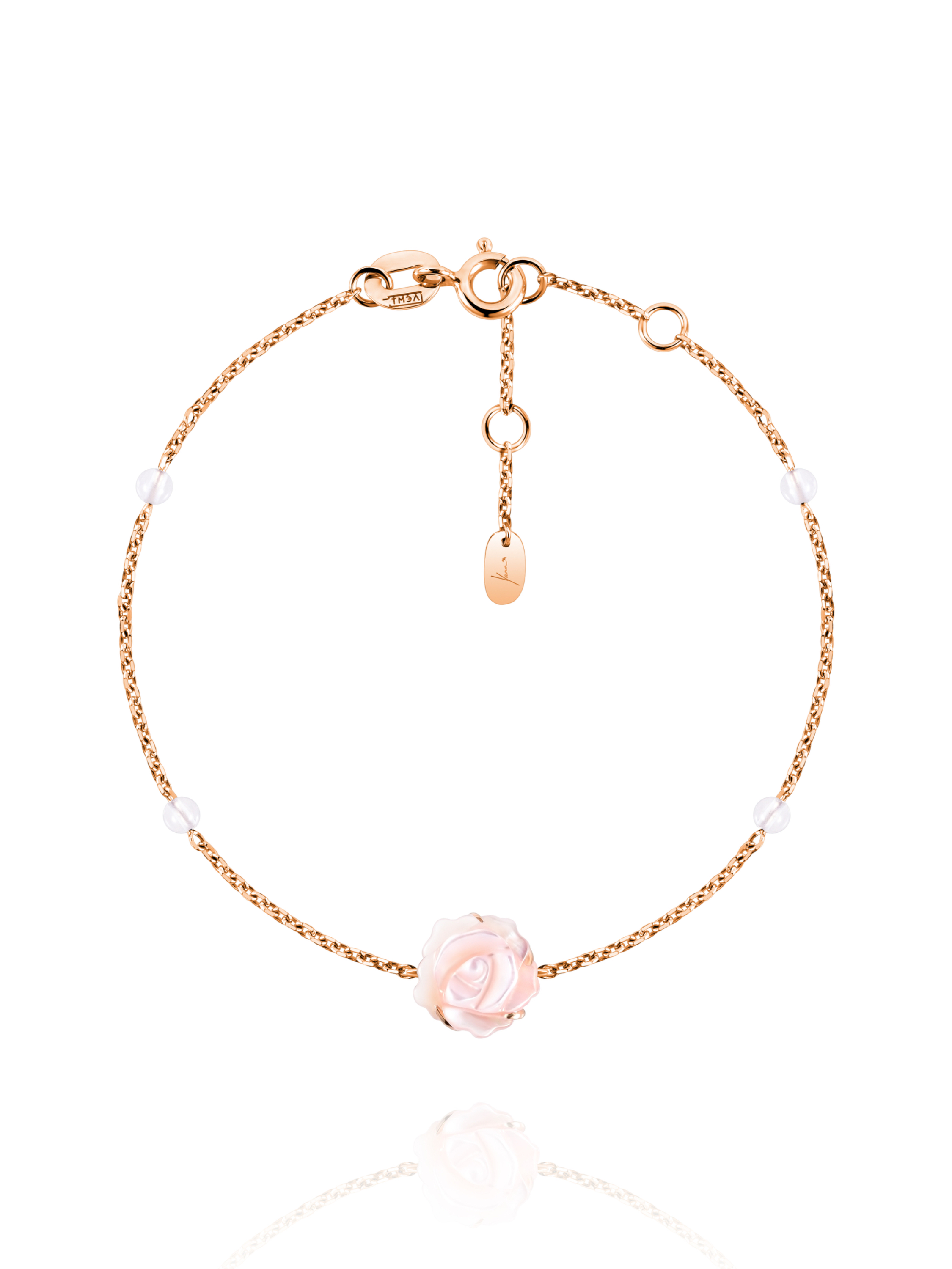 Rose gold bracelet with a rose carved from mother-of-pearl weighing 1.18 ct and 4 rock crystal beads with a total weight of 0.31 ct.