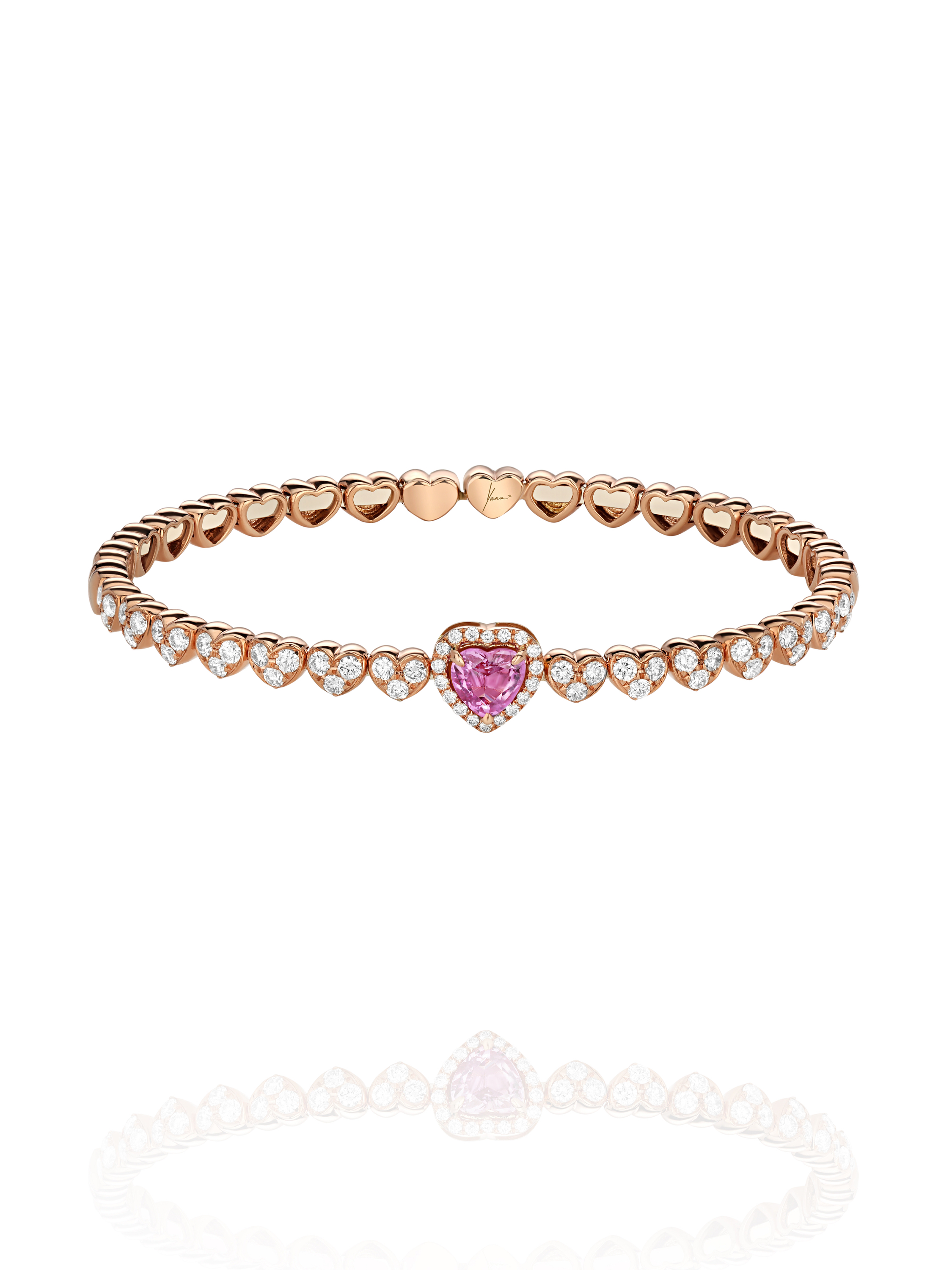 Rigid bracelet made of 750 rose gold with a heart-cut tourmaline weighing 0.85 ct and 60 round-cut diamonds with a total weight of 1.34 ct.
