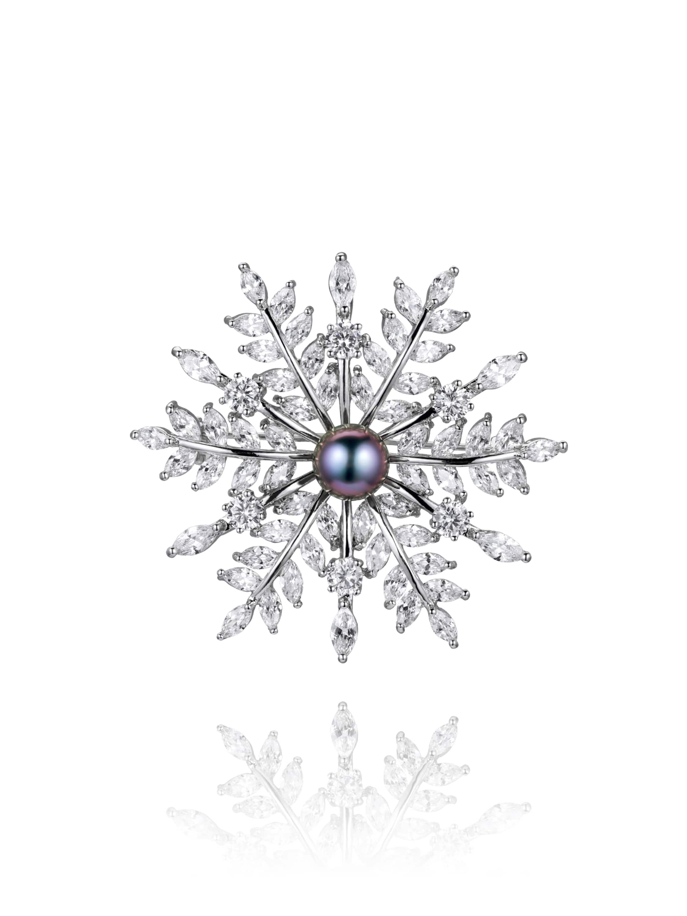 Brooch in the shape of a snowflake with natural black pearl 8.5 mm in diameter and cubic zirconia.