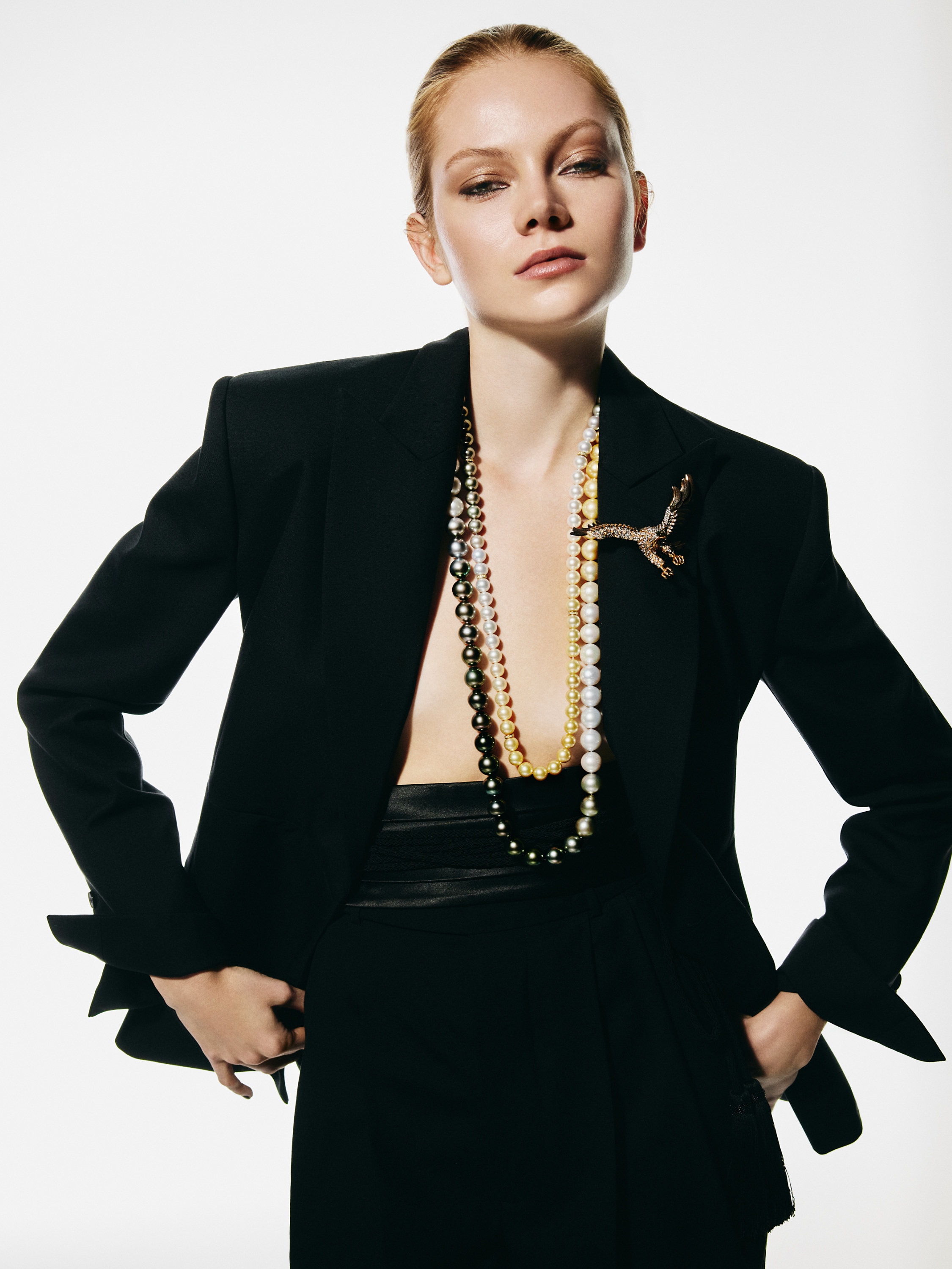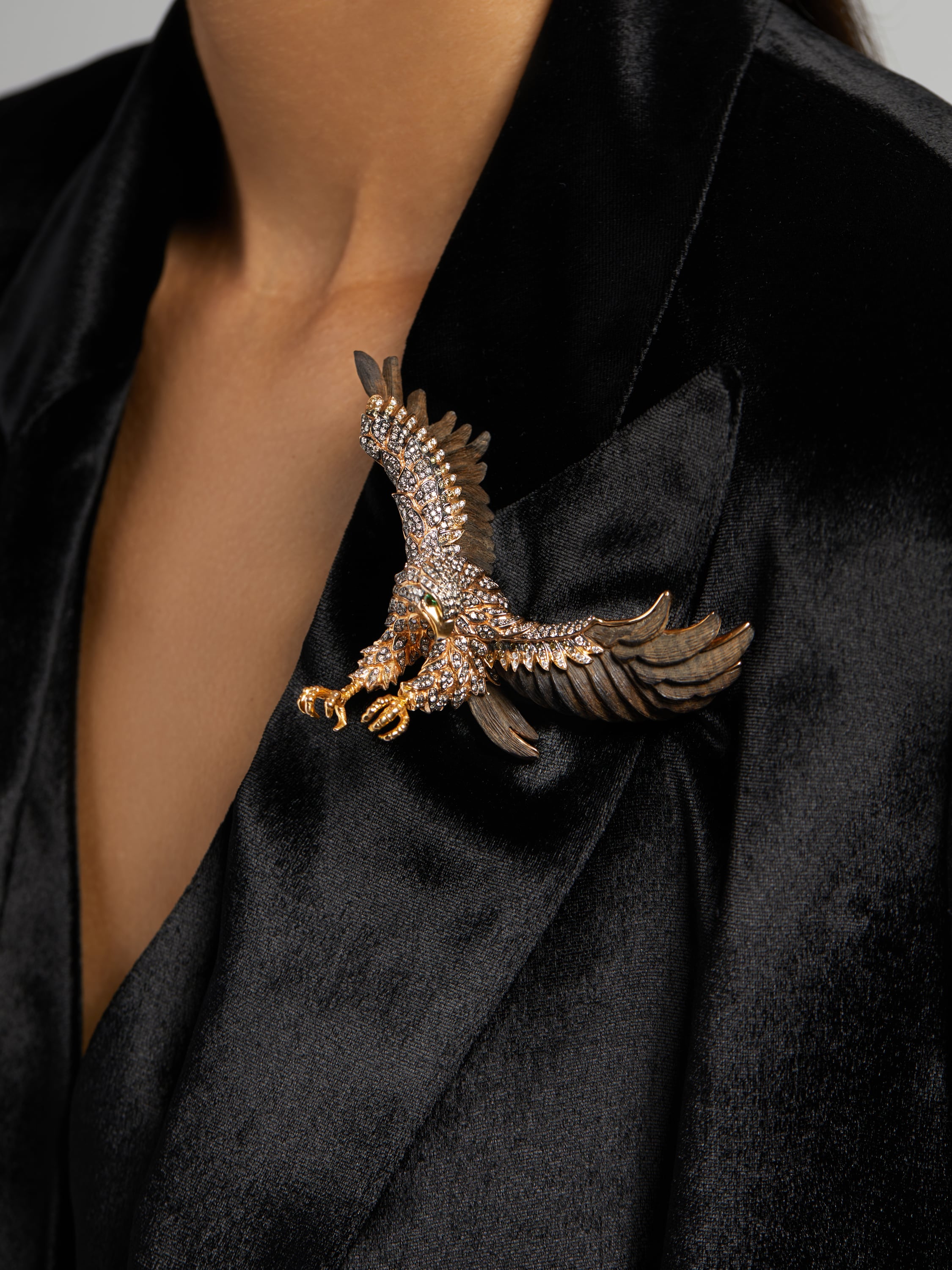 Brooch in the shape of an eagle made of rose gold with a tree weighing 6.78 g, 2 green garnets with a total weight of 0.14 ct, 23 round-cut diamonds with a total weight of 0.22 ct, 50 yellow round-cut diamonds with a total weight of 0.58 ct, and 424 brown round-cut diamonds with a total weight of 3.01 ct.