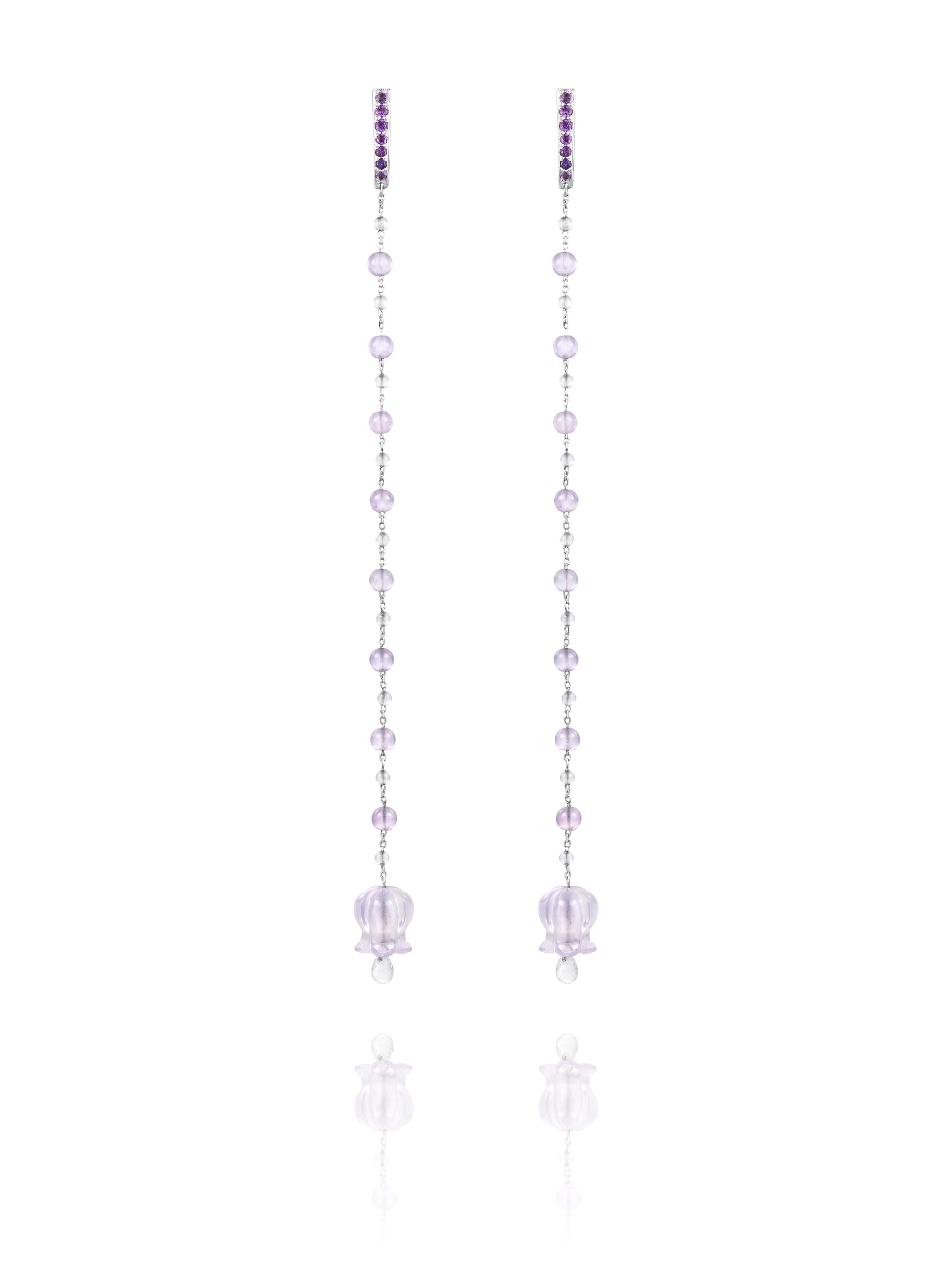 White gold earrings with 2 amethysts weighing 8.570 ct, 14 round-cut amethysts weighing 0.3 ct and 2 briolette-cut rock crystals weighing 0.58 ct. Length: 12 cm.
