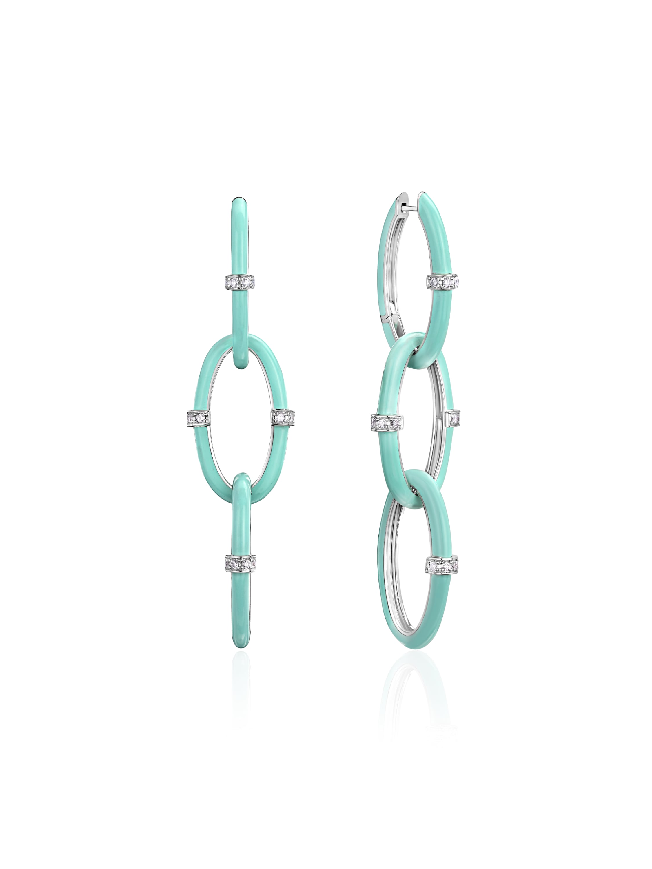 Long white gold earrings with Paraiba-colored enamel and diamonds