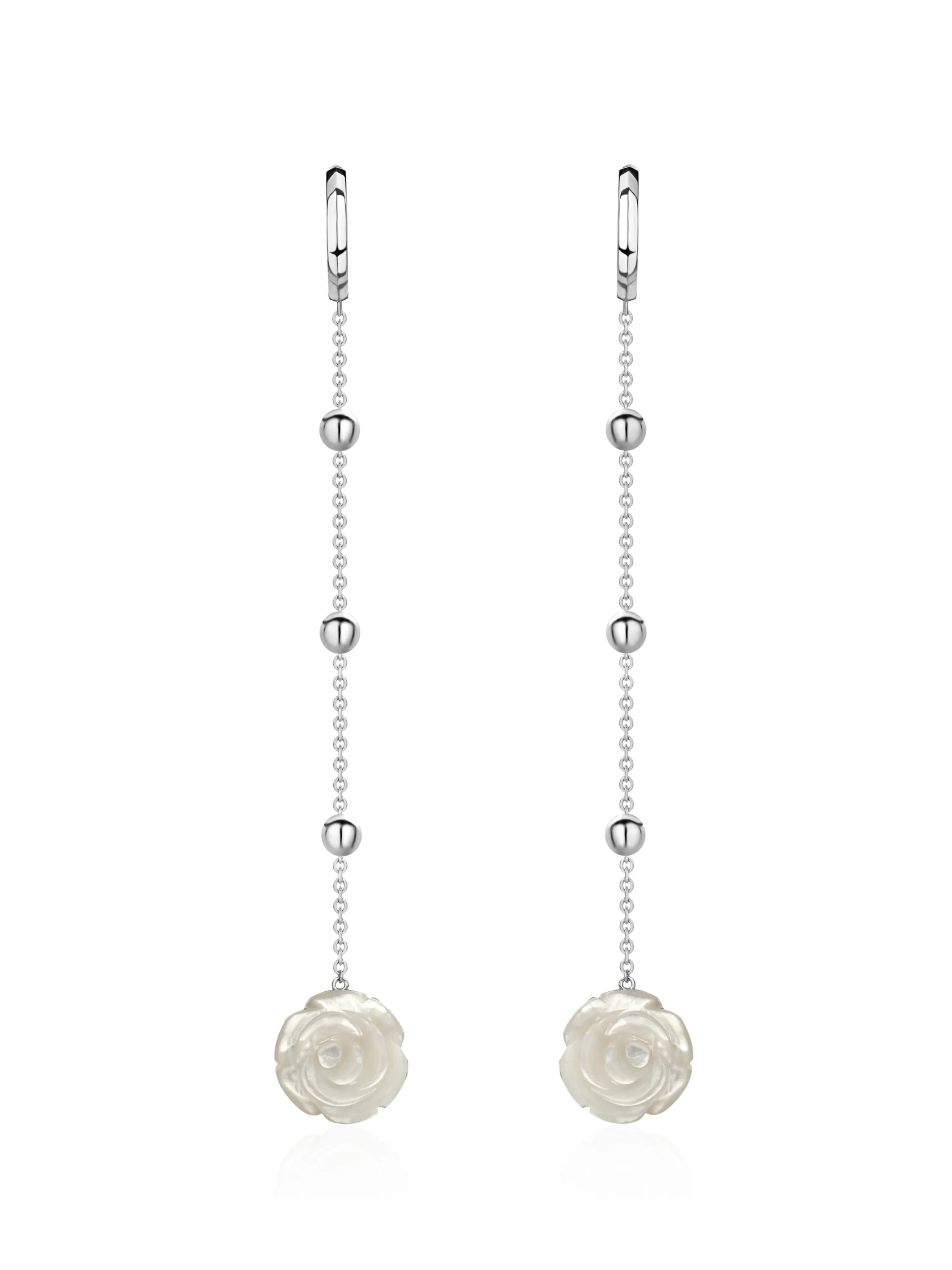Long white gold earrings with carved mother-of-pearl