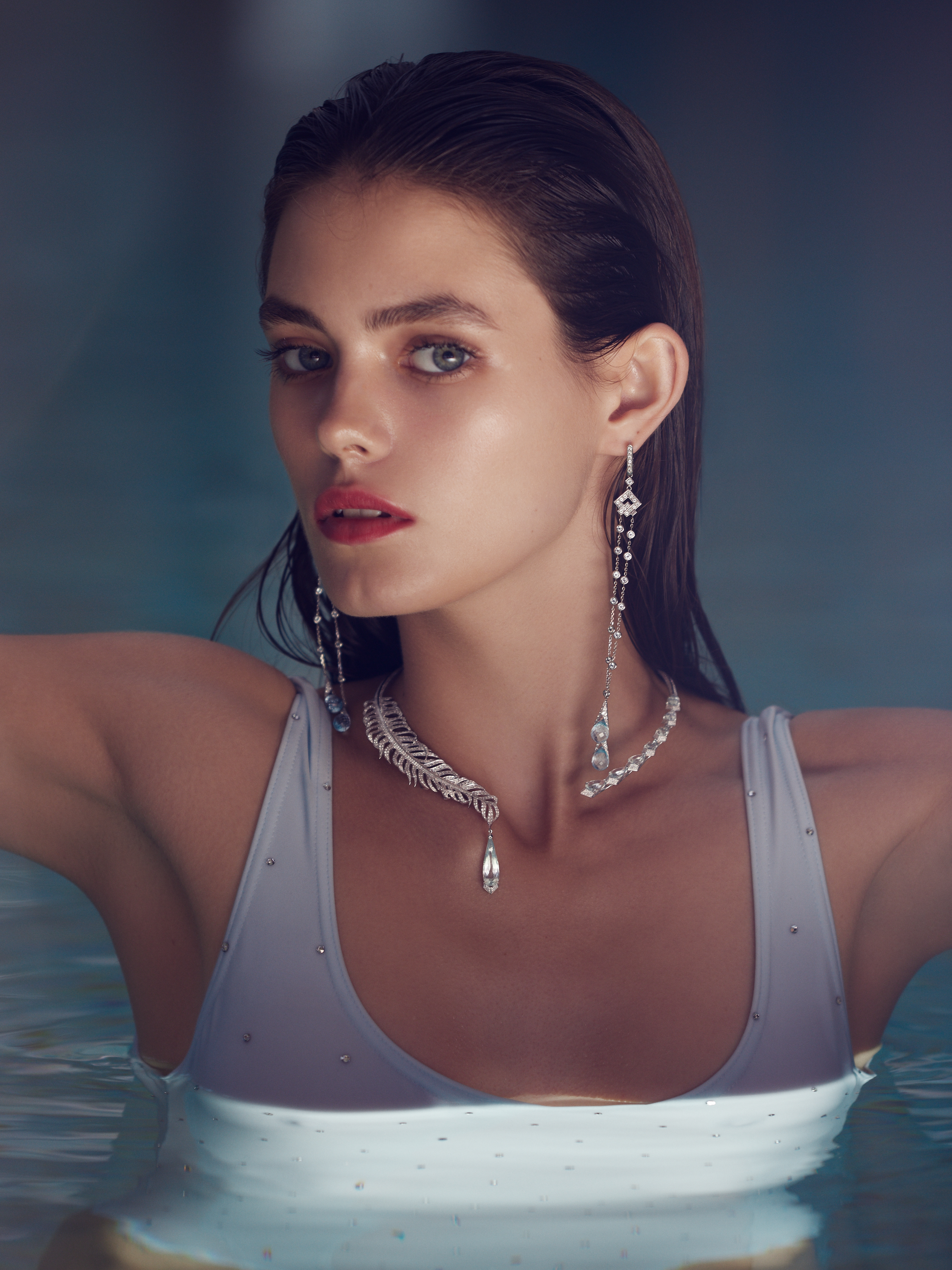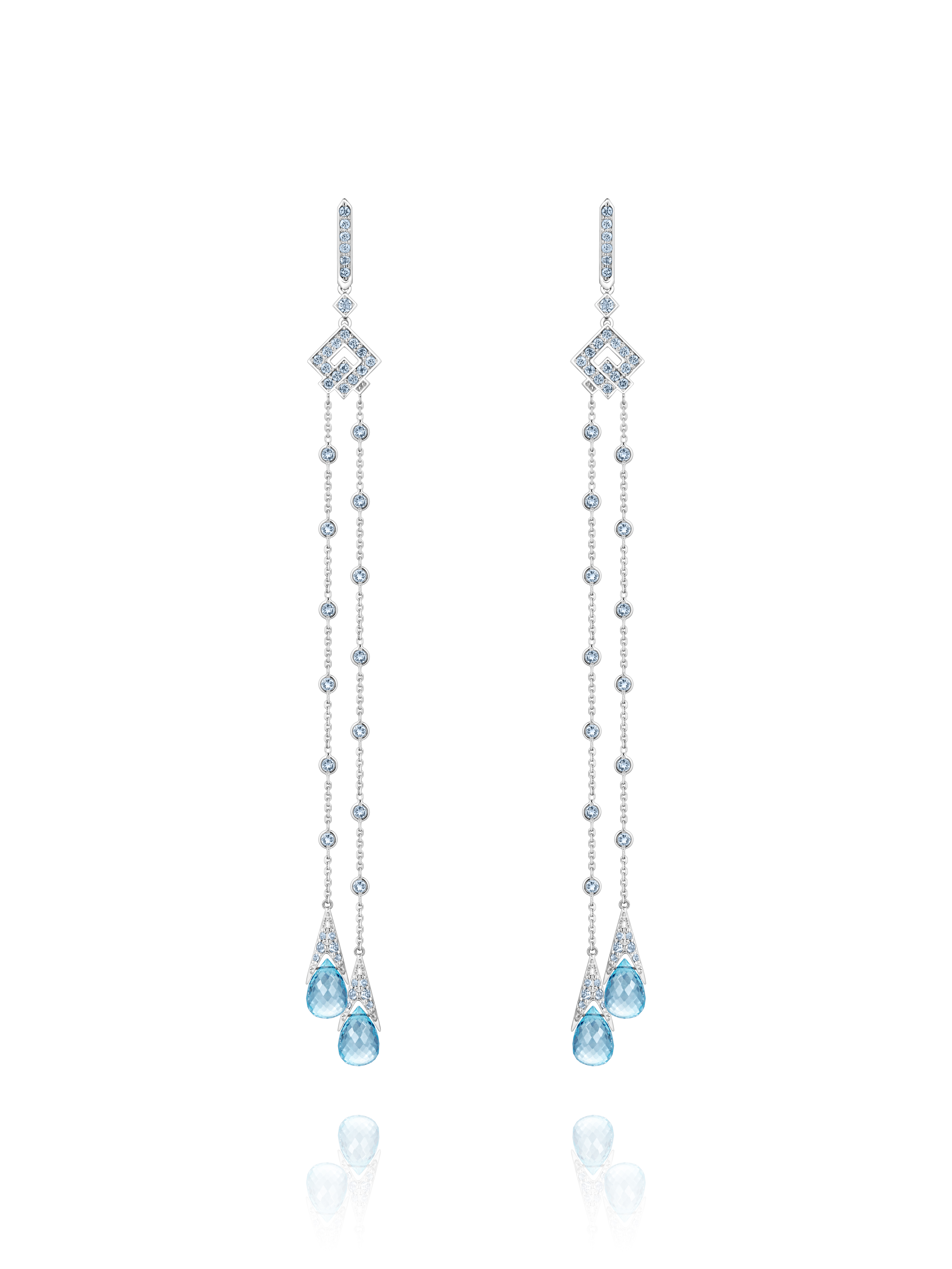 Long earrings made of white gold with 4 Sky topazes in briolette cut with a total weight of 16.10 ct and 124 Sky topazes of round cut with a total weight of 3.02 ct. Item length 13 cm.