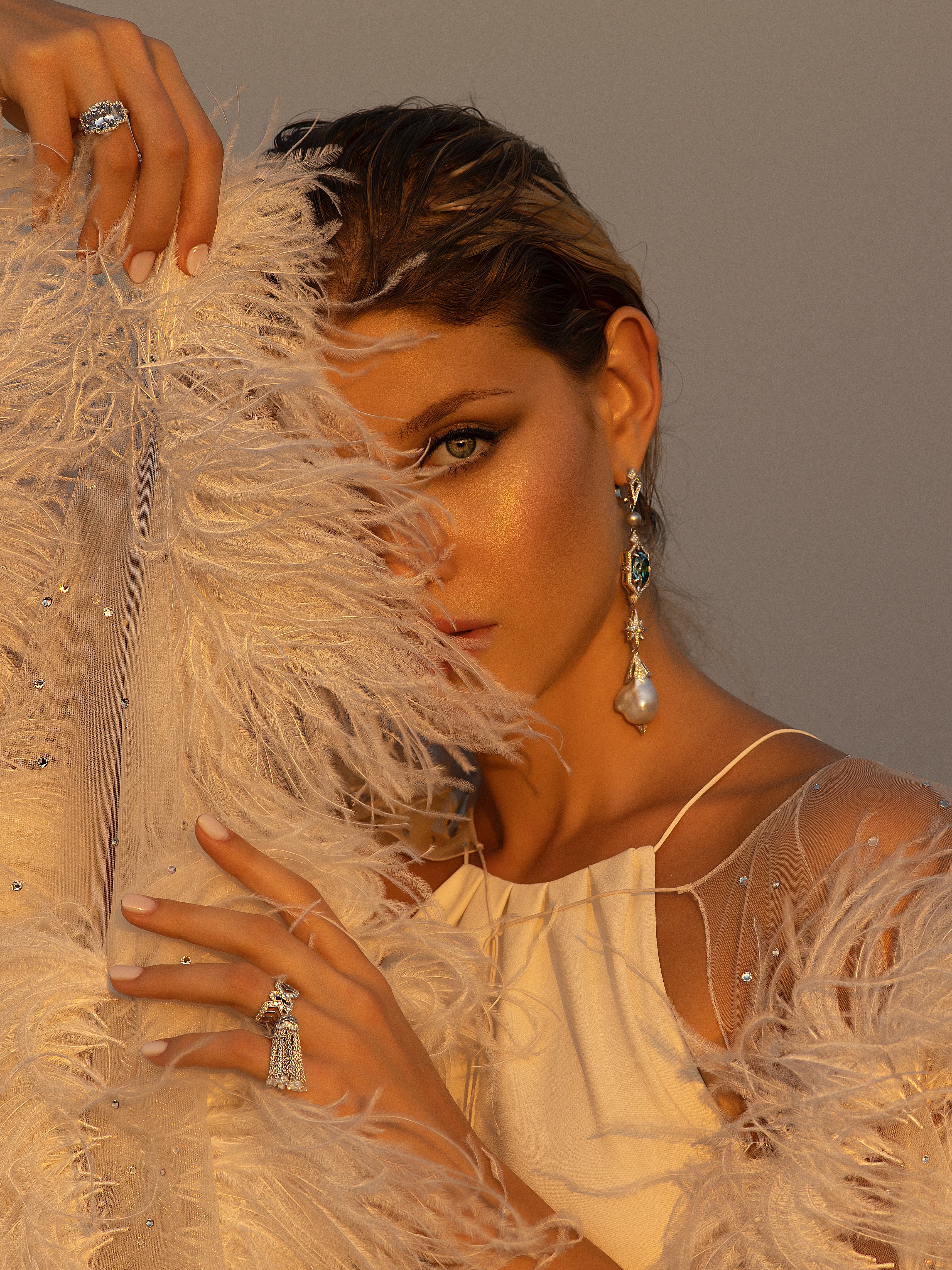 Long white gold earrings with 2 oval zircons 21.34 ct, 2 baroque pearls with a total weight of 10.16 g, 2 grey pearls with a total weight of 0.69 g, and 456 round diamonds with a total weight of 2.63 ct. Item length 10 cm.
